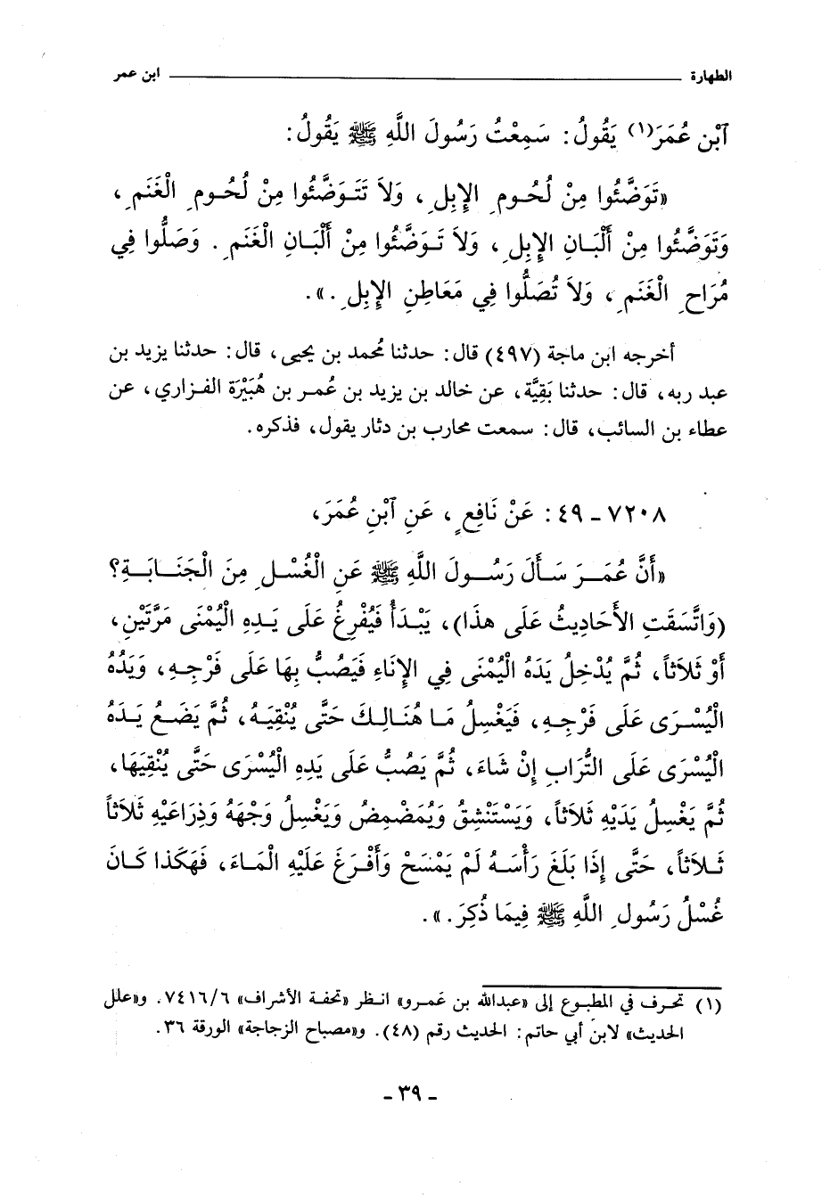 تَوَضَّئُوا مِنْ لُحُومِ الإِبِلِ وَلَا تَوَضَّئُوا مِنْ لُحُومِ الْغَنَمِ وَتَوَضَّئُوا مِنْ أَلْبَانِ الإِبِلِ وَلَا تَوَضَّئُوا مِنْ أَلْبَانِ الْغَنَمِ وَصَلُّوا فِى مَرَابِضِ الْغَنَمِ وَلَا تُصَلُّوا فِى مَعَاطِنِ الإِبِلِ.