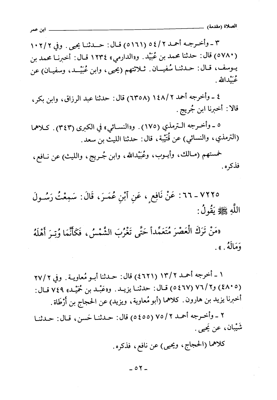 مَنْ تَرَكَ الْعَصْرَ مُتَعَمِّدًا حَتَّى تَغْرُبَ الشَّمْسُ فَكَأَنَّمَا وُتِرَ أَهْلَهُ وَمَالَهُ.