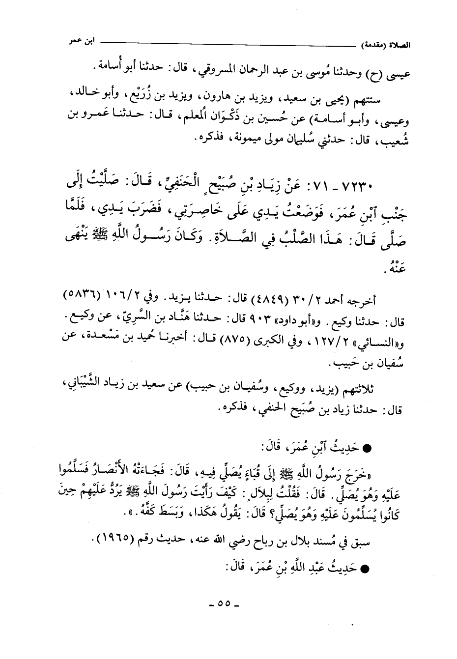 ٧٢٣٠ - عن زِيَادُ بْنُ صُبَيْحٍ الْحَنَفِىُّ قَالَ كُنْتُ قَائِمًا أُصَلِّى إِلَى الْبَيْتِ وَشَيْخٌ إِلَى جَانِبِى فَأَطَلْتُ الصَّلَاةَ فَوَضَعْتُ يَدَىَّ عَلَى خَصْرِى فَضَرَبَ الشَّيْخُ صَدْرِى بِيَدِهِ ضَرْبَةً لَا يَأْلُو فَقُلْتُ فِى نَفْسِى مَا رَابَهُ مِنِّى فَأَسْرَعْتُ الاِنْصِرافَ فَإِذَا غُلَامٌ خَلْفَهُ قَاعِدٌ فَقُلْتُ مَنْ هَذَا الشَّيْخُ قَالَ هَذَا عَبْدُ اللَّهِ بْنُ عُمَرَ. فَجَلَسْتُ حَتَّى انْصَرَفَ فَقُلْتُ أَبَا عَبْدِ الرَّحْمَنِ مَا رَابَكَ مِنِّى قَالَ أَنْتَ هُوَ قُلْتُ نَعَمْ. قَالَ ذَاكَ الصَّلْبُ فِى الصَّلَاةِ وَكَانَ رَسُولُ اللَّهِ صلى الله عليه وسلم يَنْهَى عَنْهُ.
