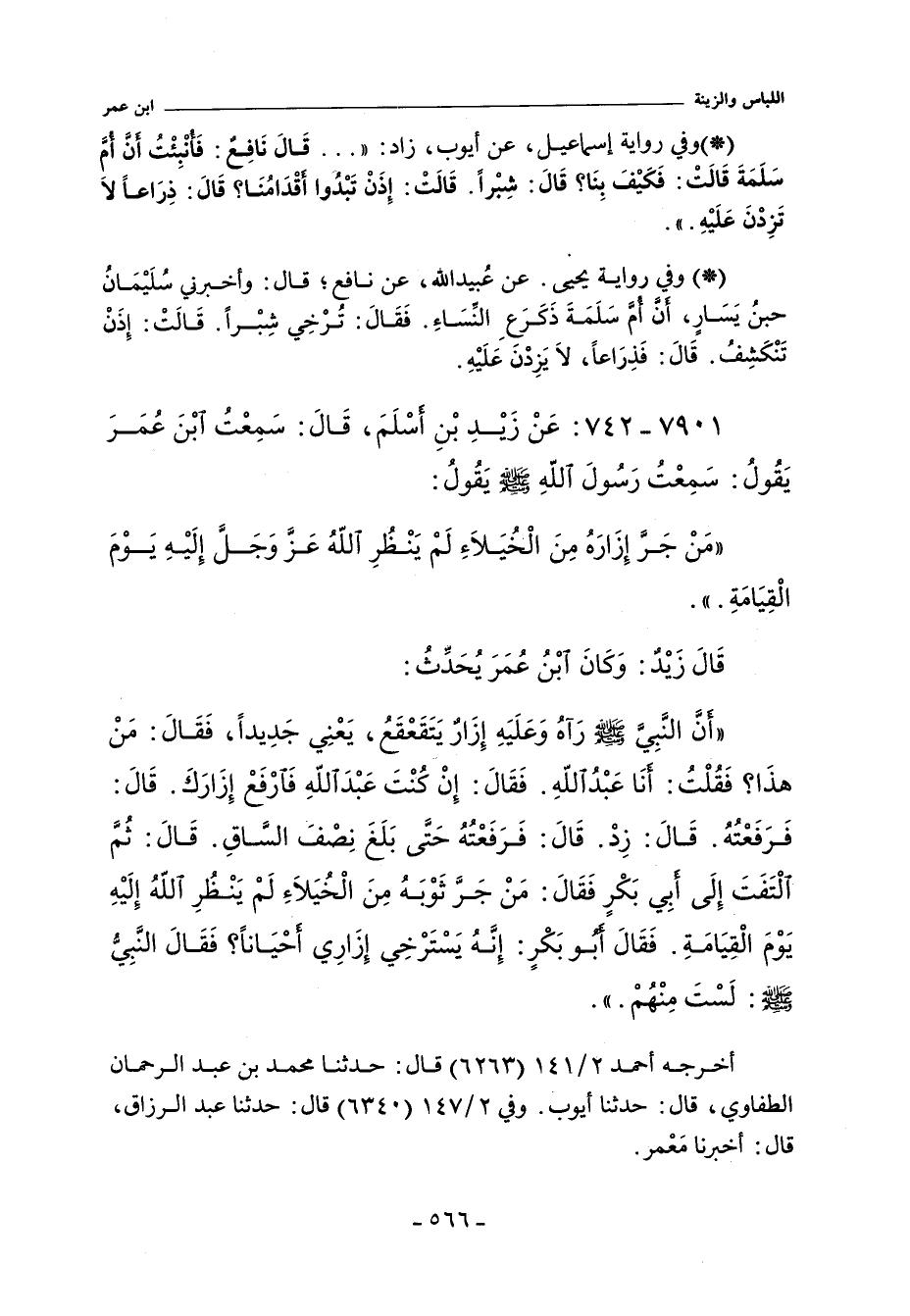 - وفي رواية: دَخَلْتُ عَلَى النَّبِىِّ صلى الله عليه وسلم وَعَلَىَّ إِزَارٌ يَتَقَعْقَعُ فَقَالَ مَنْ هَذَا قُلْتُ عَبْدُ اللَّهِ بْنُ عُمَرَ قَالَ إِنْ كُنْتَ عَبْدَ اللَّهِ فَارْفَعْ إِزَارَكَ فَرَفَعْتُ إِزَارِى إِلَى نِصْفِ السَّاقَيْنِ فَلَمْ تَزَلْ إِزْرَتَهُ حَتَّى مَاتَ.