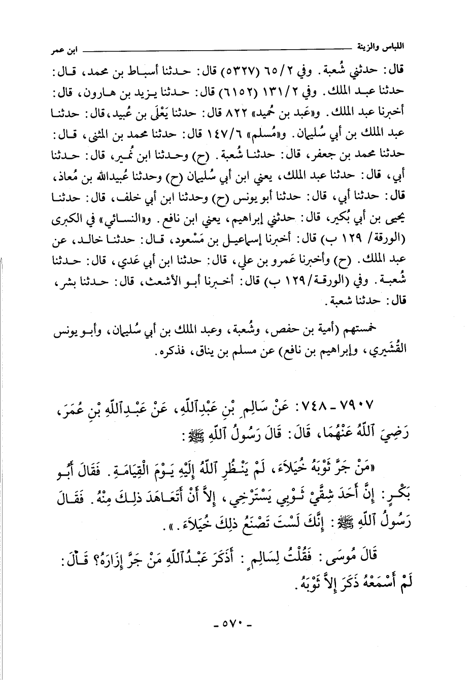 ٧٩٠٧ - عَنْ سَالِمِ بْنِ عَبْدِ اللَّهِ عَنْ عَبْدِ اللَّهِ بْنِ عُمَرَ - رضى الله عنهما - قَالَ قَالَ رَسُولُ اللَّهِ صلى الله عليه وسلم: