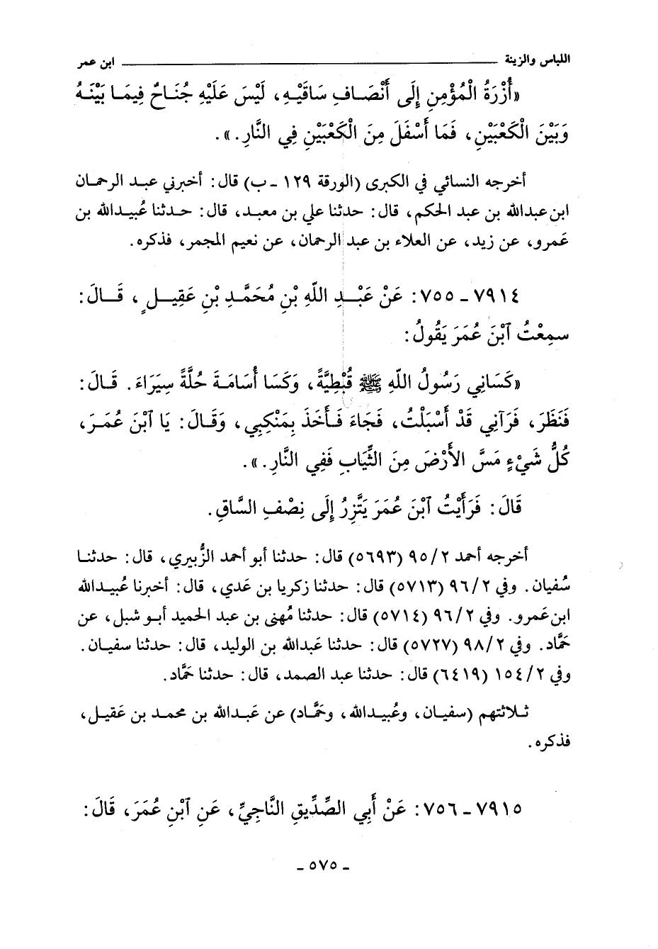 كَسَانِى رَسُولُ اللَّهِ صلى الله عليه وسلم قُبْطِيَّةً وَكَسَا أُسَامَةَ حُلَّةً سِيَرَاءَ. قَالَ فَنَظَرَ فَرَآنِى قَدْ أَسْبَلْتُ فَجَاءَ فَأَخَذَ بِمَنْكِبِى وَقَالَ يَا ابْنَ عُمَرَ كُلُّ شَىْءٍ مَسَّ الأَرْضَ مِنَ الثِّيَابِ فَفِى النَّارِ.