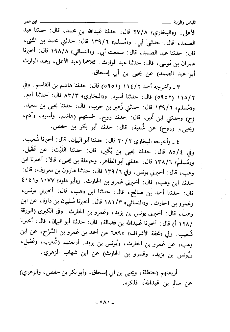 الأعلى , عن يحيى , يعني ابن أبي إسحاق. وفي ٢/ ١١٤ (٥٩٥١) قال: حدثنا هاشم بن القاسم , حدثنا شعبة , عن أبي بكر بن حفص. وفي ٢/ ١١٥ (٥٩٥٢) قال: حدثنا أسود , حدثنا شعبة , عن أبي بكر بن حفص. و"البُخَارِي" ٢/ ٢٠ (٩٤٨) قال: حدثنا أبو اليمان. قال: أخبرنا شعيب , عن الزهري. وفي ٣/ ٨٣ (٢١٠٤) قال: حدثنا آدم , حدثنا شعبة , حدثنا ابو بكر بن حفص. وفي ٤/ ٨٥ (٦٠٥٤) قال: حدثنا يحيى بن بكير , حدثنا الليث , عن عقيل , عن ابن شهاب. وفي ٨/ ٢٧ (٦٠٨١) قال: حدثنا عبد الله بن محمد , حدثنا عبد الصمد. قال: حدثني أبي قال: حدثني يحيى بن أبي إسحاق. وفي (الأدب المفرد) ٣٤٩ قال: حدثنا المكي. قال: حدثنا حنظلة. و"مسلم" ٦/ ١٣٨ (٥٤٥٤) قال: حدثني أبو الطاهر , وحرملة بن يحيى. قالا: أخبرنا ابن وهب , أخبرني يوتس , عن ابن شهاب. وفي ٦/ ١٣٩ (٥٤٥٥) قال: وحدثنا هارون بن معروف , حدثنا ابن وهب , أخبرني عمرو بن الحارث , عن ابن شهاب. وفي (٥٤٥٦) قال: حدثني زهير بن حرب , حدثنا يحيى بن سعيد , عن شعبة , أخبرني أبو بكر بن حفص. وفي (٥٤٥٧) قال: وحدثني ابن نمير , حدثنا روح , حدثنا شعبة , حدثنا أبو بكر بن حفص. وفي (٥٤٥٨) قال: حدثني محمد بن المثنى , حدثنا محمد بن الصمد. قال: سمعت أبي يحدث. قال: حدثني يحيى بن إسحاق. و"أبو داود" ١٠٧٧ و ٤٠٤١ قال: حدثنا أحمد بن صالح , حدثنا بن وهب , أخبرني يونس , وعمرو بن الحارث , عن ابن شهاب. و"النَّسائي" ٣/ ١٨١ , قال: أخبرنا سليمان بن داود، عن ابن وهب. قال: أخبرني يونس بن يزيد، وعَمرو بن الحارث , عن ابن شهاب. وفي ٨/ ١٩٨ , وفي "الكبرى" ١٦٩٩ و ٩٤٩٩ قال: أخبرنا إسحاق بن إبراهيم. قال: أنبأنا عبد الله بن الحارث المخزومي , عن حنظلة بن أبي سفيان. وفي ٨/ ١٩٨ , وفي