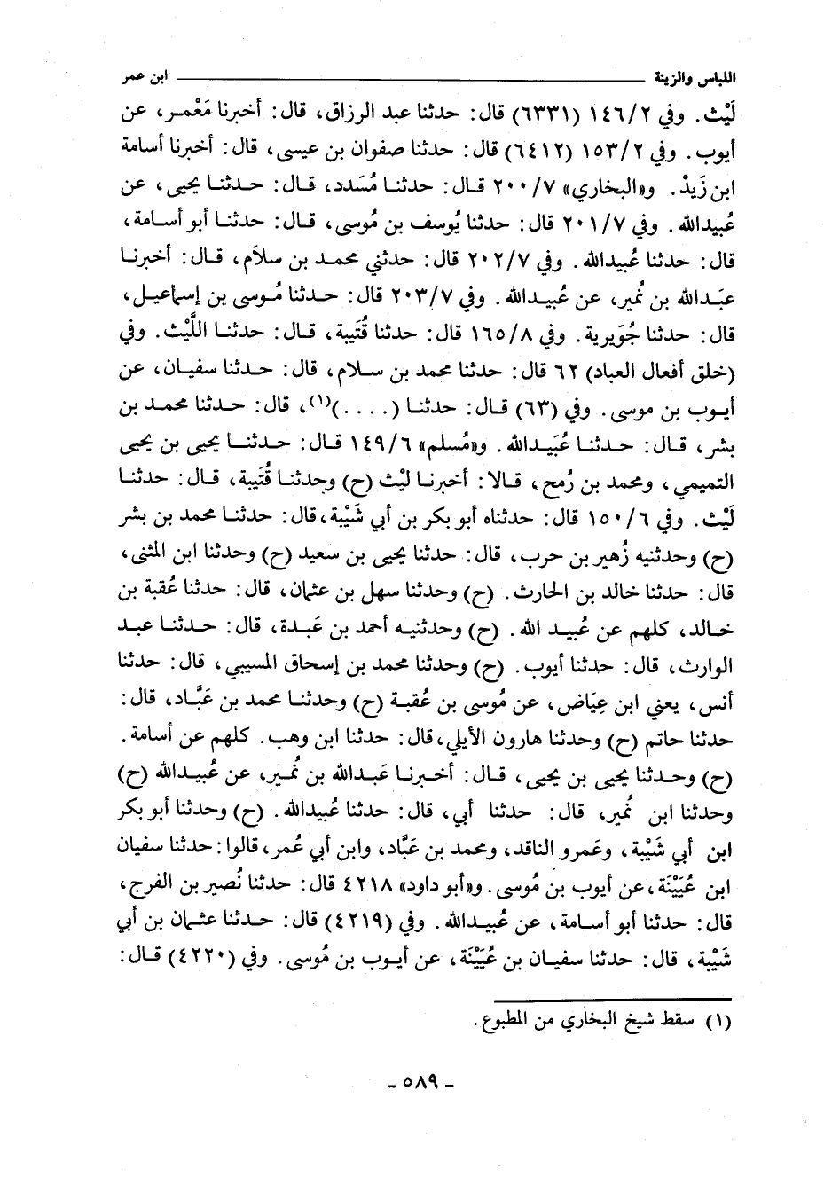 ليث. وفي ٢/ ١٤٦ (٦٣٣١) قال: حدثنا عبد الرزاق، أخبرنا معمر , عن أيوب. وفي ٢/ ١٥٣ (٦٤١٢) قال: حدثنا صفوان بن عيسى , أخبرنا أسامة بن زيد. و"البُخَارِي" ٧/ ٢٠٠ (٥٨٦٥) قال: حدثنا مُسَدد، حدثنا يحيى، عن عبيد الله. وفي ٧/ ٢٠١ (٥٨٦٦) قال: حدثنا يُوسف بن مُوسى، حدثنا أبو أسامة، حدثنا عُبيد الله. وفي ٧/ ٢٠٢ (٥٨٧٣) قال: حدثني محمد بن سلَام، أخبرنا عبد الله بن نُمير، عن عُبيد الله. وفي ٧/ ٢٠٣ (٥٨٧٦) قال: حدثنا موسى بن إسماعيل، حدثنا جُوَيرية. وفي ٨/ ١٦٥ (٦٦٥١) قال: حدثنا قُتَيبة، حدثنا اللَّيْث. وفي (خلق أفعال العباد) ٦٢ قال: حدثنا محمد بن سلام، حدثنا سفيان، عن أيوب بن موسى. وفي (٦٣) قال: حدثنا (٠٠٠٠)، قال: حدثنا محمد بن بشر، حدثنا عُبيد الله. و"مسلم" ٦/ ١٤٩ (٥٥٢٤) قال: حدثنا يحيى بن يحيى التميمي، ومحمد بن رُمح، قالا: أخبرنا الليْث (ح) وحدثنا قُتَيبة، حدثنا لَيْث. وفي ٦/ ١٥٠ (٥٥٢٥) قال: وحدثناه أبو بكر بن أبي شَيْبة، حدثنا محمد بن بشر (ح) وحدثنيه زُهيربن حرب، حدثنا يحيى بن سعيد (ح) وحدثنا ابن المثنى، حدثنا خالد بن الحارث (ح) وحدثنا سهل بن عثمان، حدثنا عُقبة بن خالد، كلهم عن عُبيد الله. وفي (٥٥٢٦)