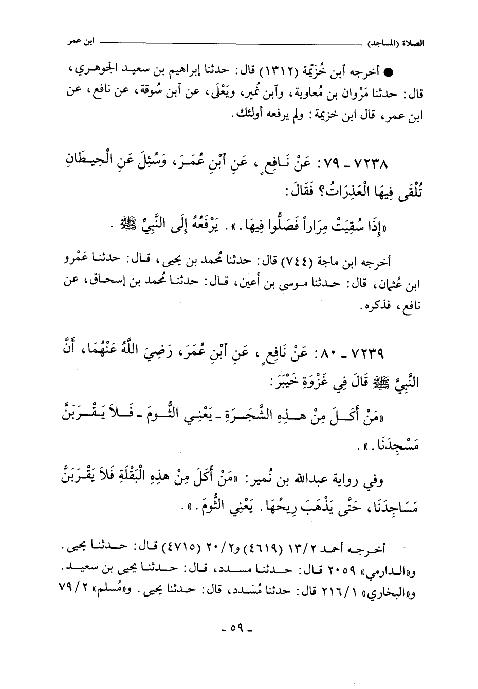 - وفي رواية: مَنْ أَكَلَ مِنْ هَذِهِ الْبَقْلَةِ فَلَا يَقْرَبَنَّ مَسَاجِدَنَا حَتَّى يَذْهَبَ رِيحُهَا يَعْنِى الثُّومَ.
