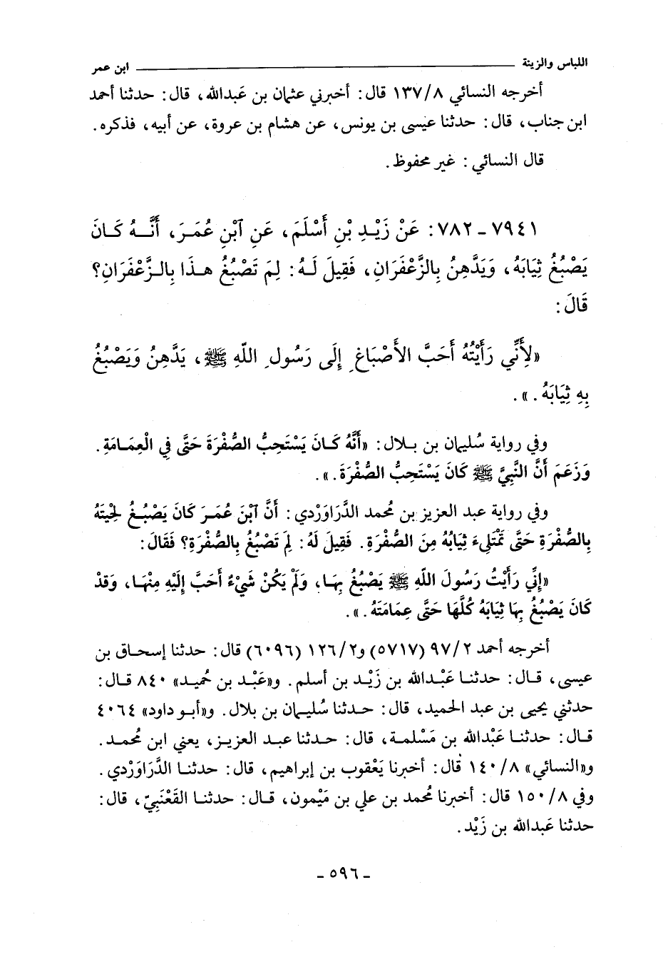 - وفي رواية عبد العزيز بن محمد الدراوردي: أَنَّ ابْنَ عُمَرَ كَانَ يَصْبُغُ لِحْيَتَهُ بِالصُّفْرَةِ حَتَّى تَمْتَلِئَ ثِيَابُهُ مِنَ الصُّفْرَةِ فَقِيلَ لَهُ لِمَ تَصْبُغُ بِالصُّفْرَةِ فَقَالَ: