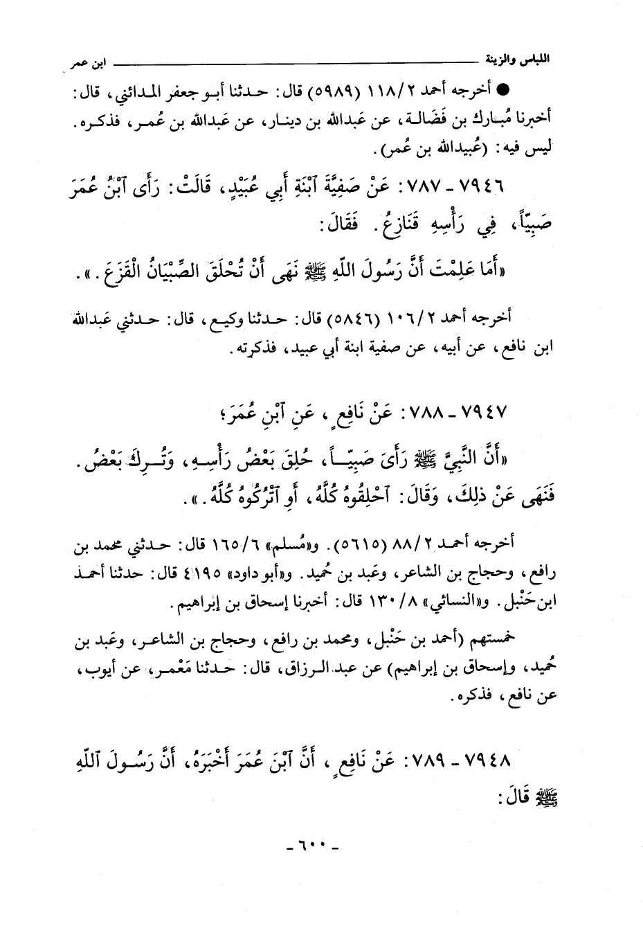٧٩٤٦ - عَنْ صَفِيَّةَ ابْنَةِ أَبِى عُبَيْدٍ قَالَتْ رَأَى ابْنُ عُمَرَ صَبِيًّا فِى رَأْسِهِ قَنَازِعُ فَقَالَ: