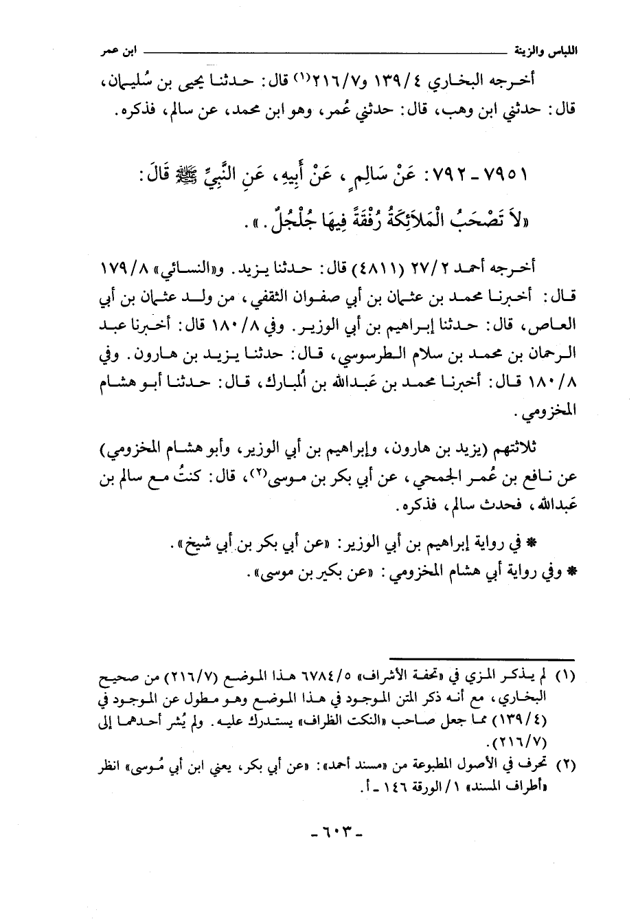 - وفي رواية: عَنْ أَبِى بَكْرٍ يَعْنِى ابْنَ مُوسَى قَالَ كُنْتُ مَعَ سَالِمِ بْنِ عَبْدِ اللَّهِ بْنِ عُمَرَ فَمَرَّتْ رُفْقَةٌ لأُمِّ الْبَنِينَ فِيهَا أَجْرَاسٌ فَحَدَّثَ سَالِمٌ عَنْ أَبِيهِ عَنِ النَّبِيِّ صلى الله عليه وسلم أَنَّهُ قَالَ لَا تَصْحَبُ الْمَلَائِكَةُ رَكْبًا مَعَهُمُ الْجُلْجُلُ فَكَمْ تَرَى فِى هَؤُلَاءِ مِنْ جُلْجُلٍ.
