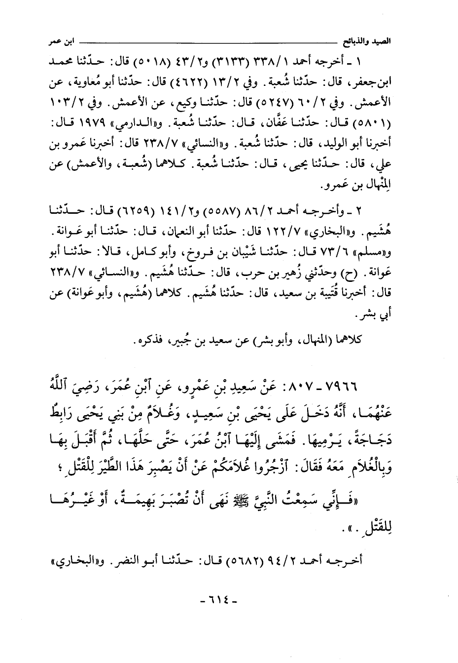 ٧٩٦٦ - عَنْ سَعِيدِ بْنِ عَمْرٍو , عَنِ ابْنِ عُمَرَ - رضى الله عنهما - أَنَّهُ دَخَلَ عَلَى يَحْيَى بْنِ سَعِيدٍ وَغُلَامٌ مِنْ بَنِى يَحْيَى رَابِطٌ دَجَاجَةً يَرْمِيهَا، فَمَشَى إِلَيْهَا ابْنُ عُمَرَ حَتَّى حَلَّهَا، ثُمَّ أَقْبَلَ بِهَا وَبِالْغُلَامِ مَعَهُ فَقَالَ ازْجُرُوا غُلَامَكُمْ عَنْ أَنْ يَصْبِرَ هَذَا الطَّيْرَ لِلْقَتْلِ؛