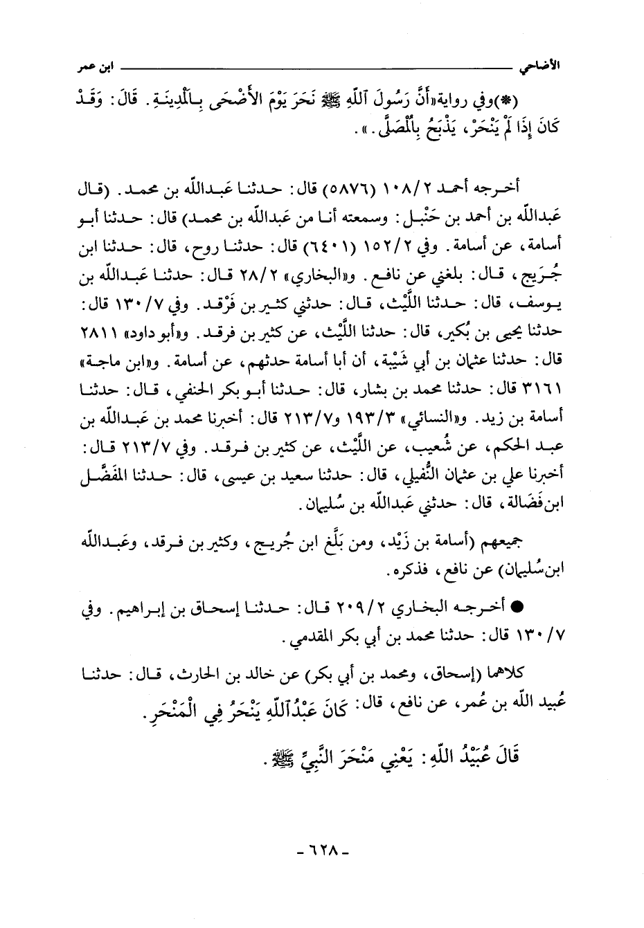 كلاهما (إسحاق، ومحمد بن أبي بكر) عن خالد بن الحارث، حدثنا عُبيد الله بن عُمر، عن نافع، قال: كَانَ عبد الله يَنْحَرُ فِي الْمَنْحَرِ (موقوف.