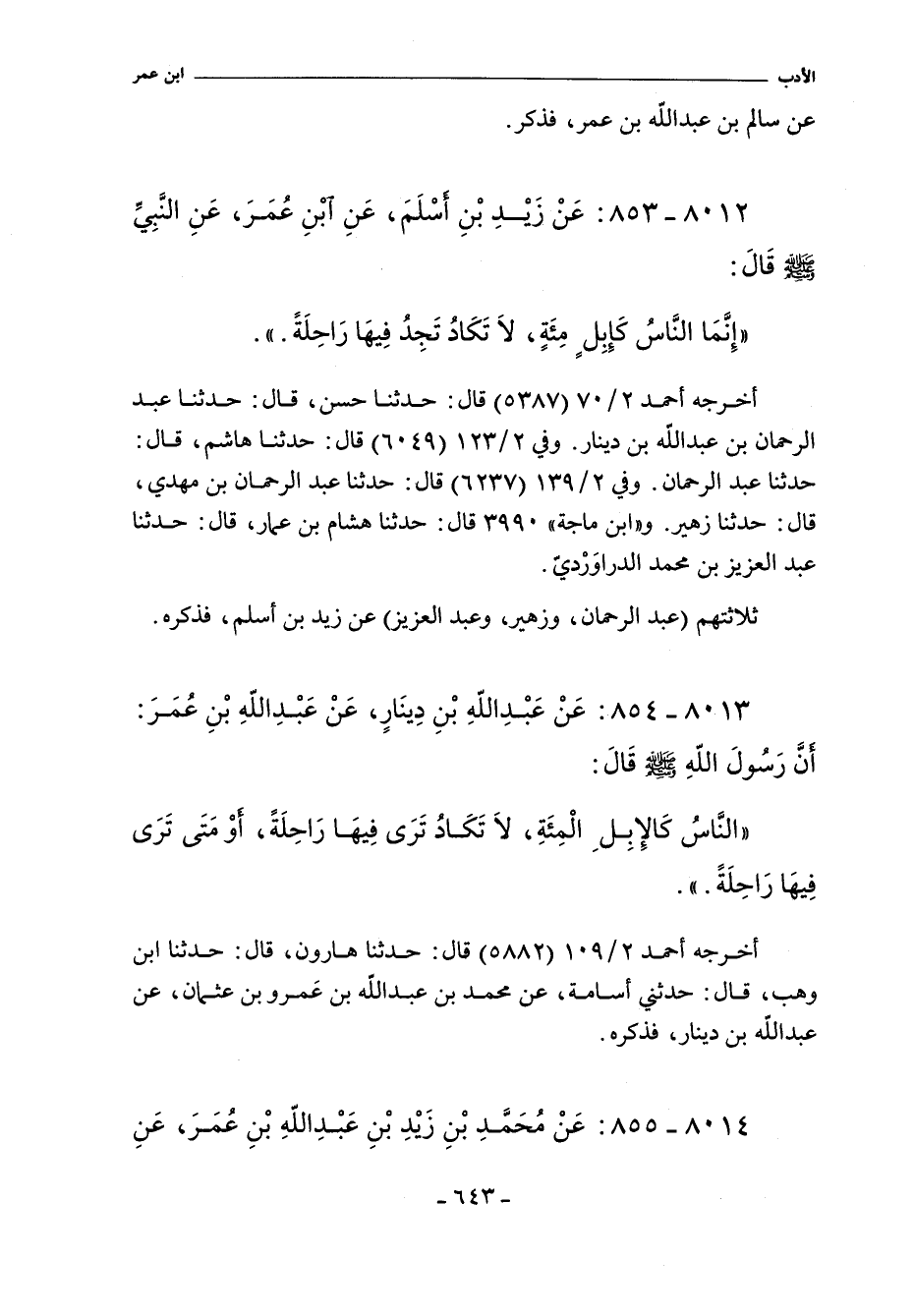 أَخْرَجَهُ أحمد ٢/ ٧٠ (٥٣٨٧) قال: حدثنا حسن، حدثنا عبد الرحمن بن عبد الله بن دينار. وفي ٢/ ١٢٣ (٦٠٤٩) قال: حدثنا هاشم، حدثنا عبد الرحمن. وفِى ٢/ ١٣٩ (٦٢٣٧) قال: حدثنا عبد الرحمن بن مهدي، حدثنا زهير. و (اابن ماجة) ٣٩٩٠ قال: حدثنا هشام بن عمار، حدثنا عبد العزيز بن محمد الدراوَرْديّ.