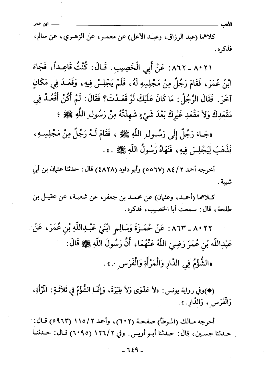 - وفي رواية: لَا عَدْوَى وَلَا طِيَرَةَ وَإِنَّمَا الشُّؤْمُ فِى ثَلَاثَةٍ الْمَرْأَةِ وَالْفَرَسِ وَالدَّارِ.