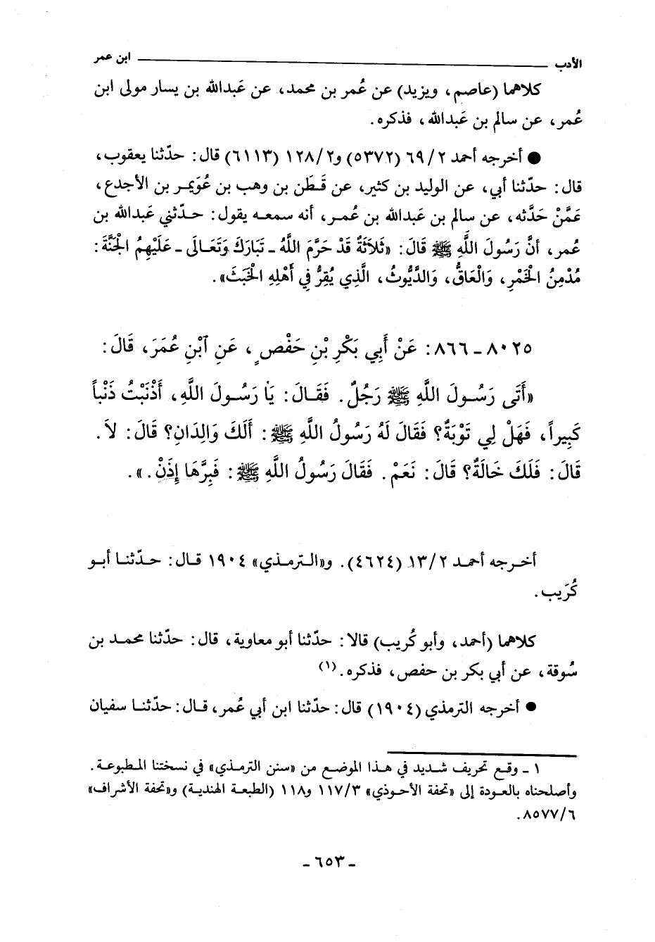 - أَخْرَجَهُ الترمذي (١٩٠٤) قال: حَدَّثَنَا ابْنُ أَبِى عُمَرَ حَدَّثَنَا سُفْيَانُ بْنُ عُيَيْنَةَ عَنْ مُحَمَّدِ بْنِ سُوقَةَ عَنْ أَبِى بَكْرِ بْنِ حَفْصِ بْنِ عُمَرَ عَنِ النَّبِيِّ صلى الله عليه وسلم نَحْوَهُ , وَلَمْ يَذْكُرْ فِيهِ (عَنِ ابْنِ عُمَرَ.