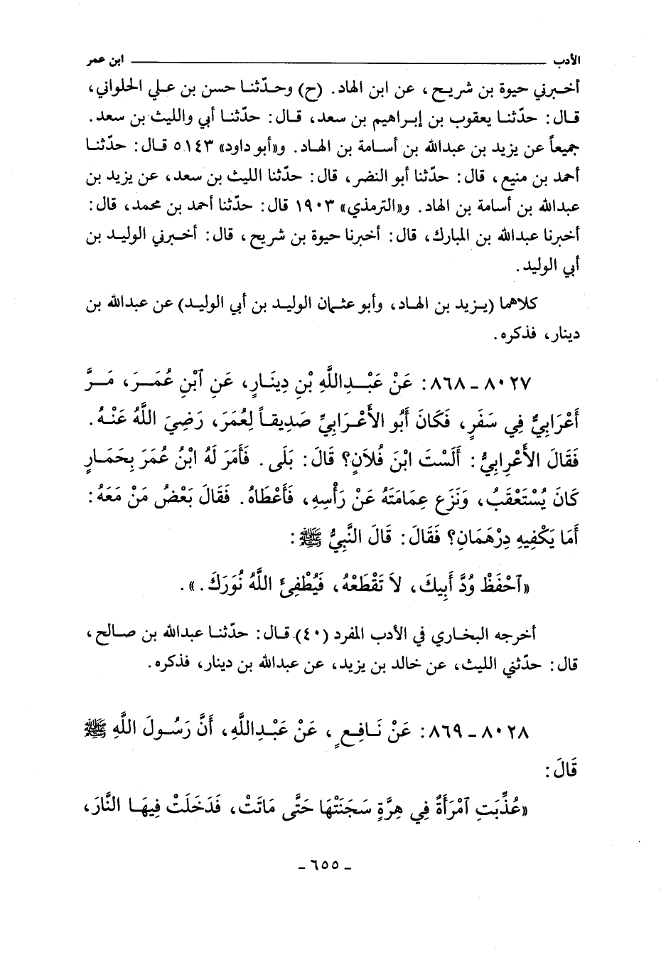 ٨٠٢٧ - عن عبد الله بن دينار عَنِ ابْنِ عُمَرَ مر أعرابى في سفر فكان أبو الأعرابي صديقا لعمر رضي الله عنه فقال الأعرابي ألست بن فلان قال بلى فأمر له بن عمر بحمار كان يستعقب ونزع عمامته عن رأسه فأعطاه فقال بعض من معه أما يكفيه درهمان فقال قال النبي صلى الله عليه وسلم: