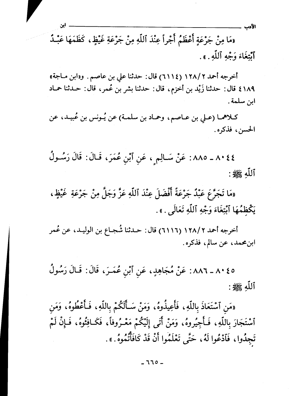 كلاهما (عبد الأعلى بن عبد الأعلى السامي , وأبو شهاب الحناط , عبد ربه بن نافع) عن يونس بن عبيد , عن الحسن , عَنِ ابْنِ عُمَرَ , قال: ما من جرعة أعظم عند الله أجرا , من جرعة غيظ , كظمها عبد , ابتغاء وجه الله. (موقوف.
