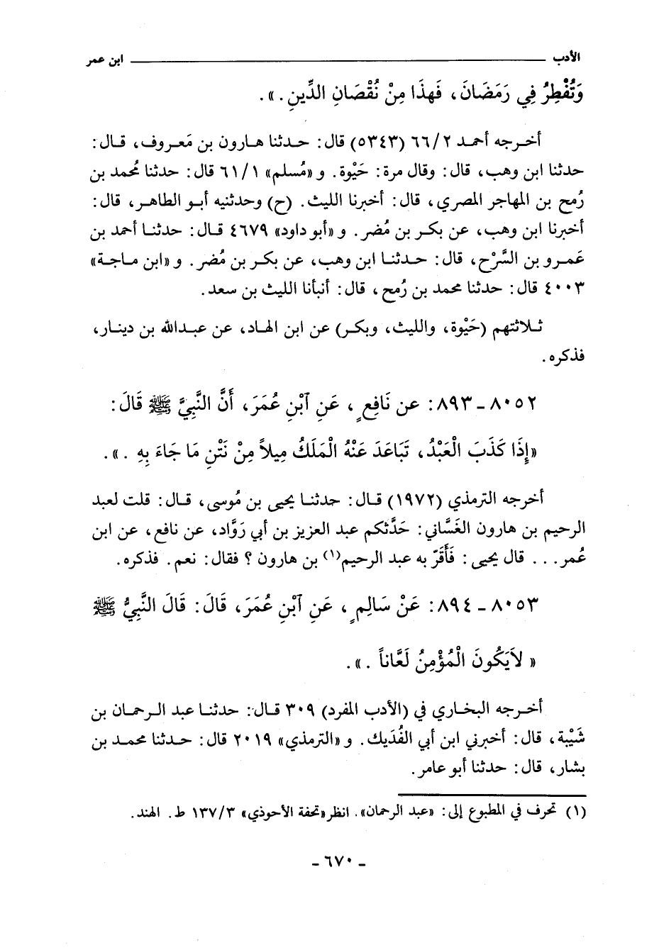 أَخْرَجَهُ الترمذي (١٩٧٢) قال: حدثنا يحيى بن مُوسى، قال: قلت لعبد الرحيم بن هارون الغَسَّاني: حَدَّثكم عبد العزيز بن أبي رَوَّاد، عن نافع، عَنِ ابْنِ عُمَرَ. قال يحيى: فَأَقَرَّ بِهِ عَبْدُ الرَّحِيمِ بْنُ هَارُونَ؟ فَقَالَ: نَعَمْ. فذكره.