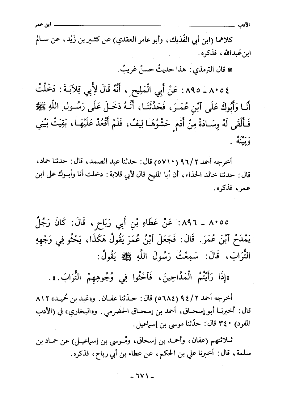 أَخْرَجَهُ أحمد ٢/ ٩٦ (٥٧١٠) قال: حدثنا عبد الصمد، حدثنا حماد، حدثنا خالد الحذاء، أن أبا المليح قال لأبي قلابة: دخلت أنا وأبوك على ابن عمر، فذكره.