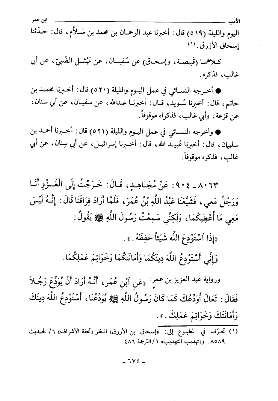 اليوم والليلة" ٥١٩ قال: أخبرنا عبد الرحمن بن محمد بن سلام. قال: حدَّثنا إسحاق الأزرق.