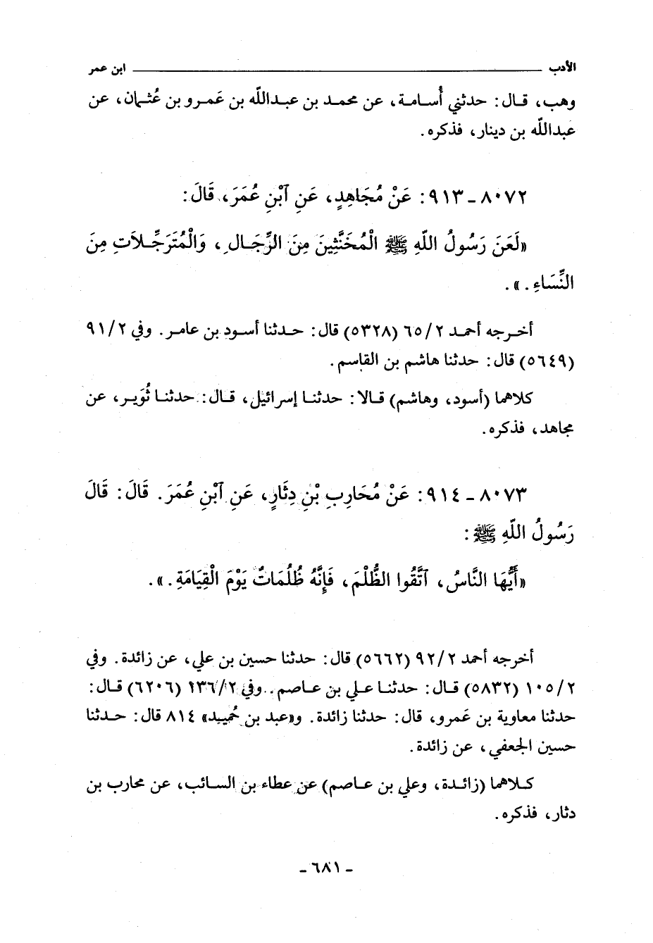 ٨٠٧٣ - عَنْ مُحَارِبِ بْنِ دِثَارٍ عَنِ ابْنِ عُمَرَ قَالَ قَالَ رَسُولُ اللَّهِ صلى الله عليه وسلم: