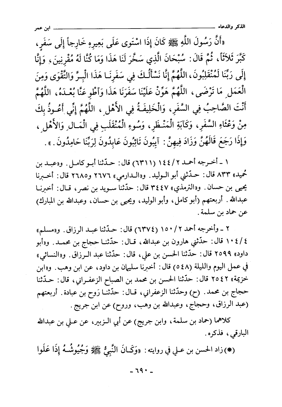 أَنَّ رَسُولَ اللَّهِ صلى الله عليه وسلم كَانَ إِذَا اسْتَوَى عَلَى بَعِيرِهِ خَارِجًا إِلَى سَفَرٍ كَبَّرَ ثَلَاثًا ثُمَّ قَالَ سُبْحَانَ الَّذِى سَخَّرَ لَنَا هَذَا وَمَا كُنَّا لَهُ مُقْرِنِينَ وَإِنَّا إِلَى رَبِّنَا لَمُنْقَلِبُونَ اللَّهُمَّ إِنَّا نَسْأَلُكَ فِى سَفَرِنَا هَذَا الْبِرَّ وَالتَّقْوَى وَمِنَ الْعَمَلِ مَا تَرْضَى اللَّهُمَّ هَوِّنْ عَلَيْنَا سَفَرَنَا هَذَا وَاطْوِ عَنَّا بُعْدَهُ اللَّهُمَّ أَنْتَ الصَّاحِبُ فِى السَّفَرِ وَالْخَلِيفَةُ فِى الأَهْلِ اللَّهُمَّ إِنِّى أَعُوذُ بِكَ مِنْ وَعْثَاءِ السَّفَرِ وَكَآبَةِ الْمَنْظَرِ وَسُوءِ الْمُنْقَلَبِ فِى الْمَالِ وَالأَهْلِ وَإِذَا رَجَعَ قَالَهُنَّ. وَزَادَ فِيهِنَّ آيِبُونَ تَائِبُونَ عَابِدُونَ لِرَبِّنَا حَامِدُونَ.