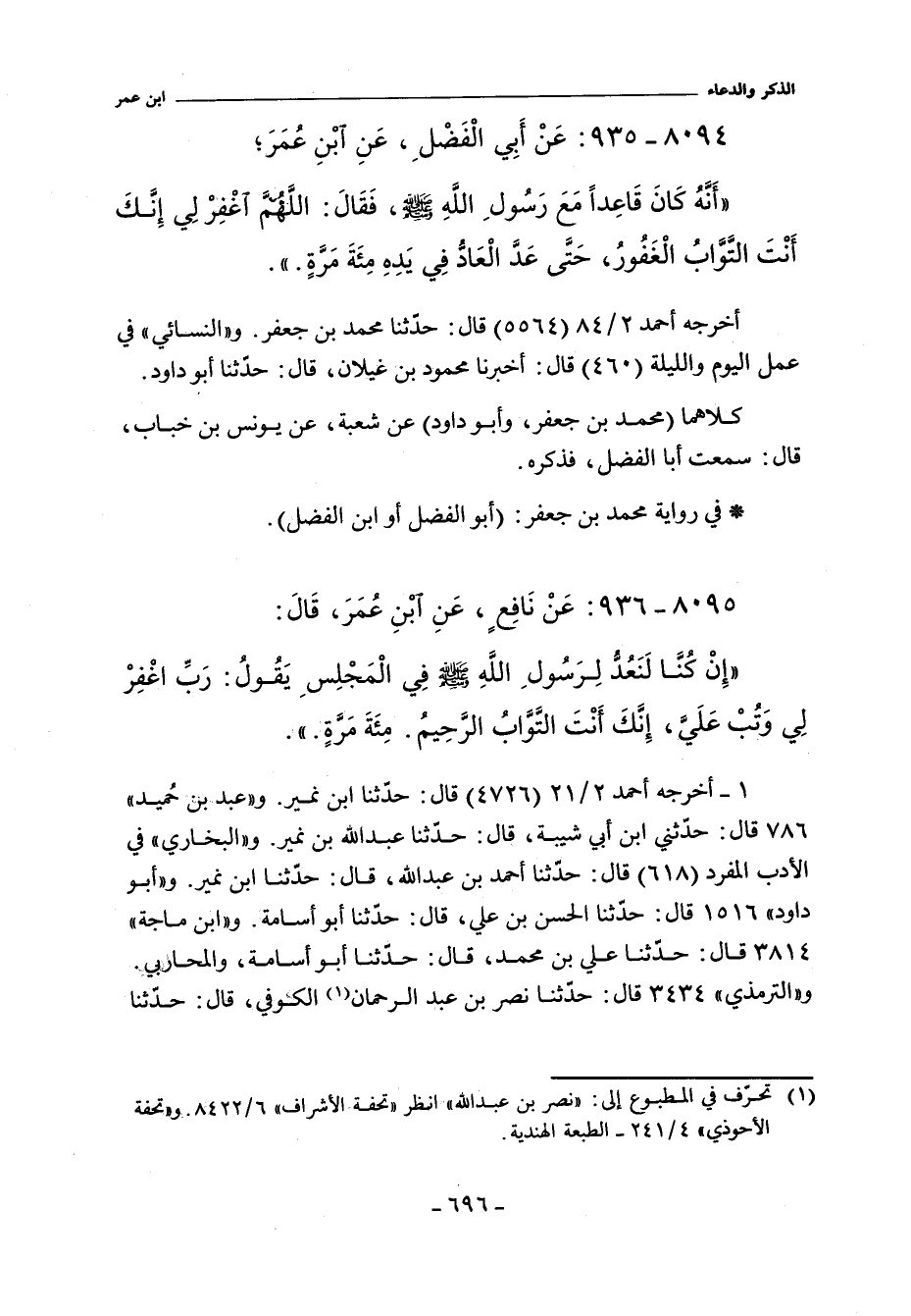 أَخْرَجَهُ أحمد ٢/ ٢١ (٤٧٢٦) قال: حدثنا ابن نمير، عن مالك، يعني ابن مغول. و"عَبد بن حُميد" ٧٨٦ قال: حدّثني ابن أبي شيبة، حدّثنا عبد الله بن نمير، عن مالك بن مغول. و"البُخَارِي" في (الأدب المفرد) ٦١٨ قال: حدّثنا أحمد بن عبد الله، حدّثنا ابن نمير، عن مالك بن مغول. و"أبو داود" ١٥١٦ قال: حدّثنا الحسن بن علي، حدثنا أبو أسامة، عن مالك بن مغول. و (اابن ماجة) ٣٨١٤ قال: حدّثنا علي بن محمد، حدّثنا أبو أسامة، والمحاربي، عن مالك بن مغول. والتِّرْمِذِيّ" ٣٤٣٤ قال: حدّثنا نصر بن عبد الرحمن الكوفي، حدّثنا
