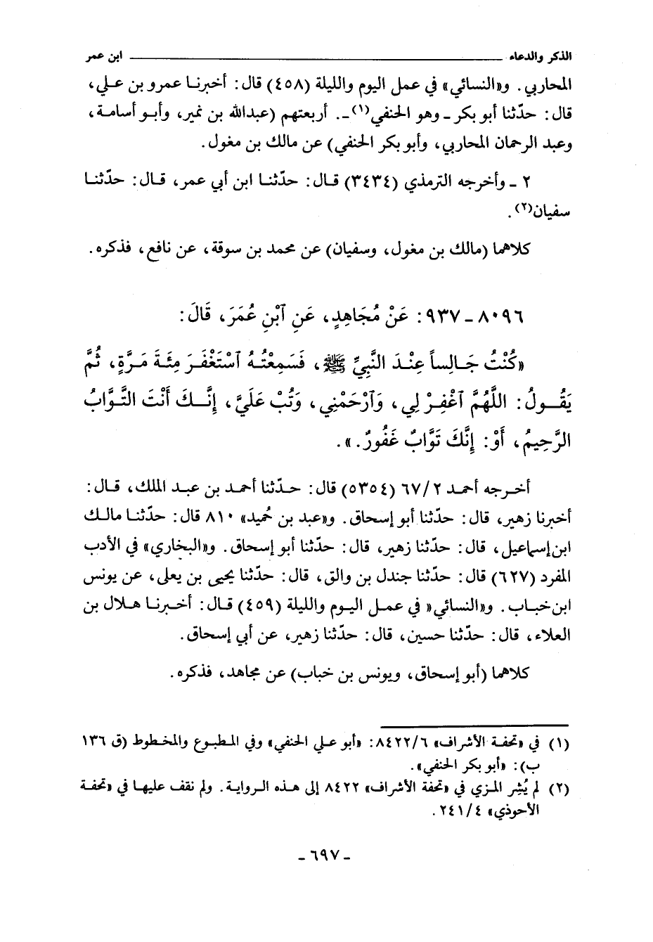 كُنْتُ جَالِسًا عِنْدَ النَّبِىِّ صلى الله عليه وسلم فَسَمِعْتُهُ اسْتَغْفَرَ اللَّهَ مِائَةَ مَرَّةٍ ثُمَّ يَقُولُ اللَّهُمَّ اغْفِرْ لِى وَارْحَمْنِى وَتُبْ عَلَىَّ إِنَّكَ أَنْتَ التَّوَّابُ الرَّحِيمُ أَوْ إِنَّكَ تَوَّابٌ غَفُورٌ.