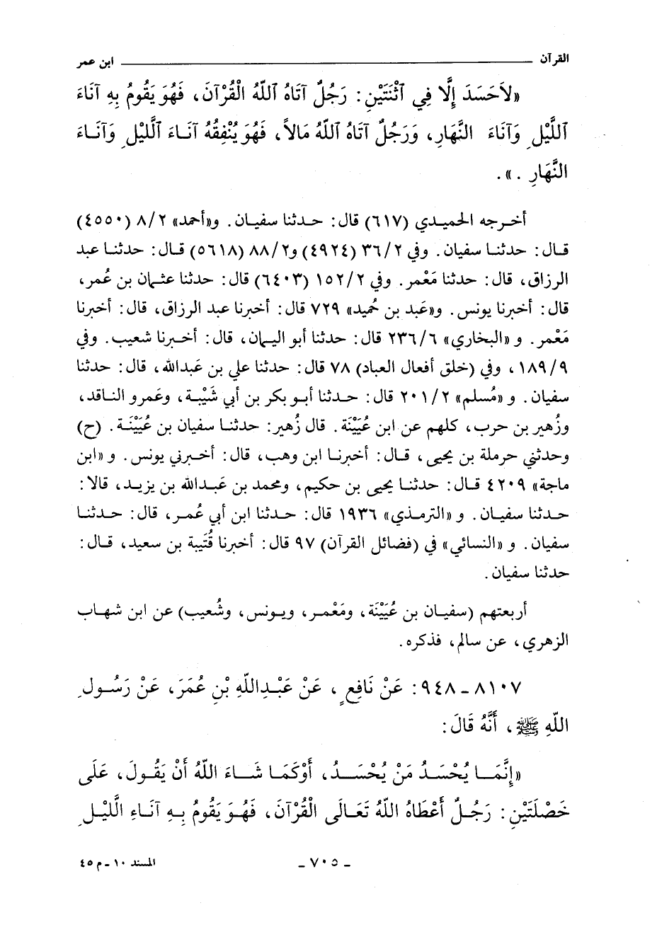 لَا حَسَدَ إِلَاّ فِى اثْنَتَيْنِ رَجُلٌ آتَاهُ اللَّهُ الْقُرْآنَ فَهُوَ يَقُومُ بِهِ آنَاءَ اللَّيْلِ وَآنَاءَ النَّهَارِ وَرَجُلٌ آتَاهُ اللَّهُ مَالاً فَهُوَ يُنْفِقُهُ آنَاءَ اللَّيْلِ وَآنَاءَ النَّهَارِ.