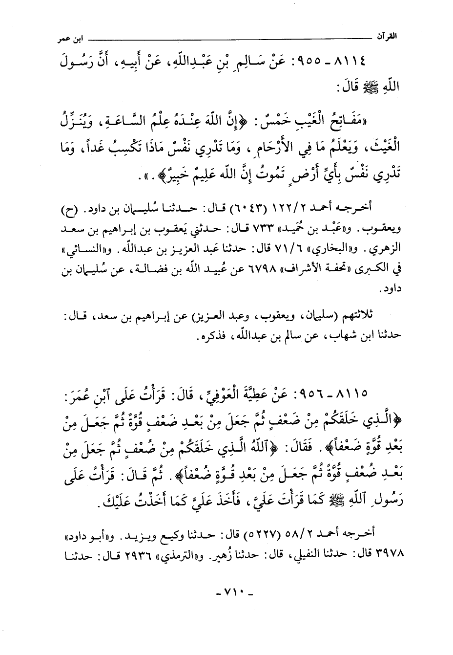 - رواية نُعَيْمُ بْنُ مَيْسَرَةَ مختصرة على: عَنِ ابْنِ عُمَرَ أَنَّهُ قَرَأَ عَلَى النَّبِىِّ صلى الله عليه وسلم (خَلَقَكُمْ مِنْ ضَعْفٍ) فَقَالَ (مِنْ ضُعْفٍ).