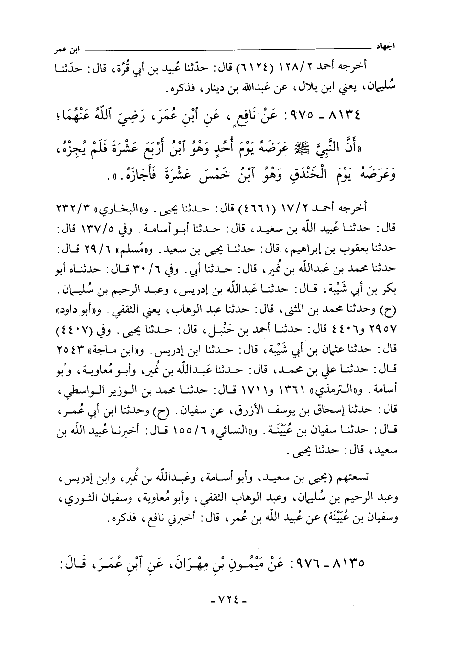 أَخْرَجَهُ أحمد ٢/ ١٧ (٤٦٦١) قال: حدثنا يحيى، عن عبيد الله. و"البُخَارِي" ٣/ ٢٣٢ (٢٦٦٤) قال: حدثنا عُبيد الله بن سعيد، حدثنا أبو أسامة. قال: حدثني عبيد الله. وفي ٥/ ١٣٧ (٤٠٩٧) قال: حدثنا يعقوب بن إبراهيم، حدثنا يحيى بن سعيد، عن عبيد الله. و"مسلم" ٦/ ٢٩ (٤٨٧٠) قال: حدثنا محمد بن عبد الله بن نُمير، حدثنا أبي، حدثنا عبيد الله. وفي ٦/ ٣٠ (٤٨٧١) قال: وحدثناه أبو بكر بن أبي شَيْبة، حدثنا عبد الله بن إدريس، وعبد الرحيم بن سُليمان (ح) وحدثنا محمد بن المثنى، حدثنا عبد الوهاب، يعني الثقفي، جميعا عن عبيد الله. و"أبو داود" ٢٩٥٧ و ٤٤٠٦ قال: حدثنا أحمد بن حَنْبل، حدثنا يحيى، عن عبيد الله. وفي (٤٤٠٧) قال: حدثنا عثمان بن أبي شَيْبة، حدثنا ابن إدريس.، عَنْ عُبَيْدِ اللَّهِ بْنِ عُمَر. و (اابن ماجة) ٢٥٤٣ قال: حدثنا علي بن محمد، حدثنا عبد الله بن نُمير، وأبو مُعاوية، وأبو أسامة. قالوا: حدثنا عبيد الله بن عمر. والتِّرْمِذِيّ" ١٣٦١ و ١٧١١ قال: حدثنا محمد بن الوزير الواسطي، حدثنا إسحاق بن يوسف الأزرق، عن سفيان، عَنْ عُبَيْدِ اللَّهِ بْنِ عُمَر (ح) وحدثنا ابن أبي عُمر، حدثنا سفيان بن عُيَيْنَة، عَنْ عُبَيْدِ اللَّهِ بْنِ عُمَر. و"النَّسائي" ٦/ ١٥٥، وفي "الكبرى" ٥٥٩٥ و ٨٨٢٦ قال: أخبرنا غبيد الله بن سعيد. قال: حدثنا يحيى.