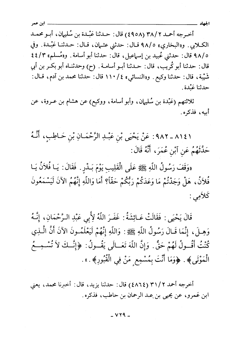 وَقَفَ رَسُولُ اللَّهِ صلى الله عليه وسلم عَلَى الْقَلِيبِ يَوْمَ بَدْرٍ فَقَالَ يَا فُلَانُ يَا فُلَانُ هَلْ وَجَدْتُمْ مَا وَعَدَكُمْ رَبُّكُمْ حَقًّا أَمَا وَاللَّهِ إِنَّهُمُ الآنَ لَيَسْمَعُونَ كَلَامِى
