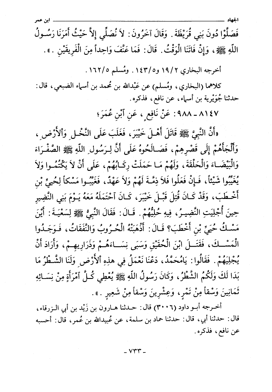 أَنَّ النَّبِىَّ صلى الله عليه وسلم قَاتَلَ أَهْلَ خَيْبَرَ فَغَلَبَ عَلَى النَّخْلِ وَالأَرْضِ وَأَلْجَأَهُمْ إِلَى قَصْرِهِمْ فَصَالَحُوهُ عَلَى أَنَّ لِرَسُولِ اللَّهِ صلى الله عليه وسلم الصَّفْرَاءَ وَالْبَيْضَاءَ وَالْحَلْقَةَ وَلَهُمْ مَا حَمَلَتْ رِكَابُهُمْ عَلَى أَنْ لَا يَكْتُمُوا وَلَا يُغَيِّبُوا شَيْئًا فَإِنْ فَعَلُوا فَلَا ذِمَّةَ لَهُمْ وَلَا عَهْدَ فَغَيَّبُوا مَسْكًا لِحُيَىِّ بْنِ أَخْطَبَ وَقَدْ كَانَ قُتِلَ قَبْلَ خَيْبَرَ كَانَ احْتَمَلَهُ مَعَهُ يَوْمَ بَنِى النَّضِيرِ حِينَ أُجْلِيَتِ النَّضِيرُ فِيهِ حُلِيُّهُمْ قَالَ فَقَالَ النَّبِىُّ صلى الله عليه وسلم لِسَعْيَةَ أَيْنَ مَسْكُ حُيَىِّ بْنِ أَخْطَبَ قَالَ أَذْهَبَتْهُ الْحُرُوبُ وَالنَّفَقَاتُ. فَوَجَدُوا الْمَسْكَ فَقَتَلَ ابْنَ أَبِى الْحُقَيْقِ وَسَبَى نِسَاءَهُمْ وَذَرَارِيَّهُمْ وَأَرَادَ أَنْ يُجْلِيَهُمْ فَقَالُوا يَا مُحَمَّدُ دَعْنَا نَعْمَلْ فِى هَذِهِ الأَرْضِ وَلَنَا الشَّطْرُ مَا بَدَا لَكَ وَلَكُمُ الشَّطْرُ. وَكَانَ رَسُولُ اللَّهِ صلى الله عليه وسلم يُعْطِى كُلَّ امْرَأَةٍ مِنْ نِسَائِهِ ثَمَانِينَ وَسْقًا مِنْ تَمْرٍ وَعِشْرِينَ وَسْقًا مِنْ شَعِيرٍ.