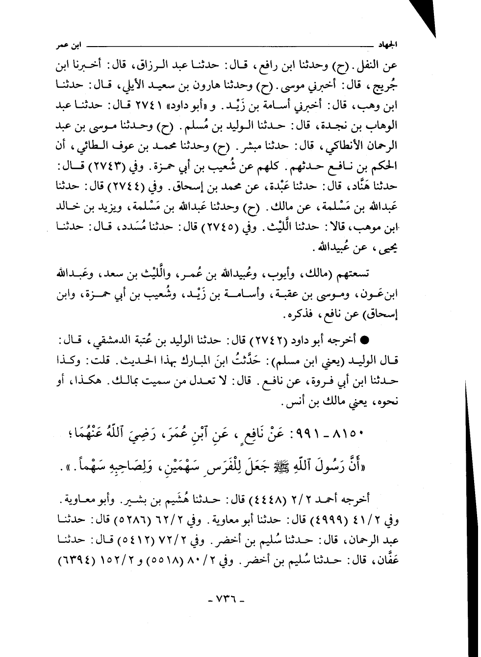 بن سعيد الأيلي، حدثنا ابن وهب، أخبرني أسامة بن زَيْد. و"أبو داود" ٢٧٤١ قال: حدثنا عبد الوهاب بن نجدة، حدثنا الوليد بن مُسلم (ح) وحدثنا موسى بن عبد الرحمن الأنطاكي، قال: حدثنا مبشر (ح) وحدثنا محمد بن عوف الطائي، أن الحكم بن نافع حدثهم. كلهم عن شُعيب بن أبي حمزة. وفي (٢٧٤٣) قال: حدثنا هَنَاد، قال: حدثنا عَبْدة، يعني ابن سليمان الكلابي، عن محمد بن إسحاق. وفي (٢٧٤٤) قال: حدثنا عبد الله بن مَسْلمة القعنبي، عن مالك (ح) وحدثنا عبد الله بن مَسْلمة، ويزيد بن خالد بن موهب، قالا: حدثنا اَلليث المعنى. وفي (٢٧٤٥) قال: حدثنا مُسَدد، حدثنا يحيى، عن عُبيد الله.