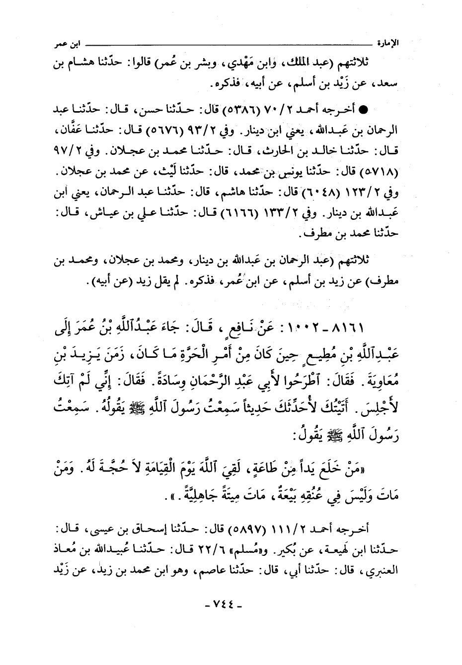 - وفي رواية: إِنَّ عَبْدَ اللَّهِ بْنَ عُمَرَ أَتَى ابْنَ مُطِيعٍ فَقَالَ اطْرَحُوا لأَبِى عَبْدِ الرَّحْمَنِ وِسَادَةً. فَقَالَ مَا جِئْتُ لأَجْلِسَ عِنْدَكَ وَلَكِنْ جِئْتُ أُخْبِرُكَ مَا سَمِعْتُ مِنْ رَسُولِ اللَّهِ صلى الله عليه وسلم سَمِعْتُهُ يَقُولُ مَنْ نَزَعَ يَدًا مِنْ طَاعَةٍ أَوْ فَارَقَ الْجَمَاعَةَ مَاتَ مِيتَةَ الْجَاهِلِيَّةِ.