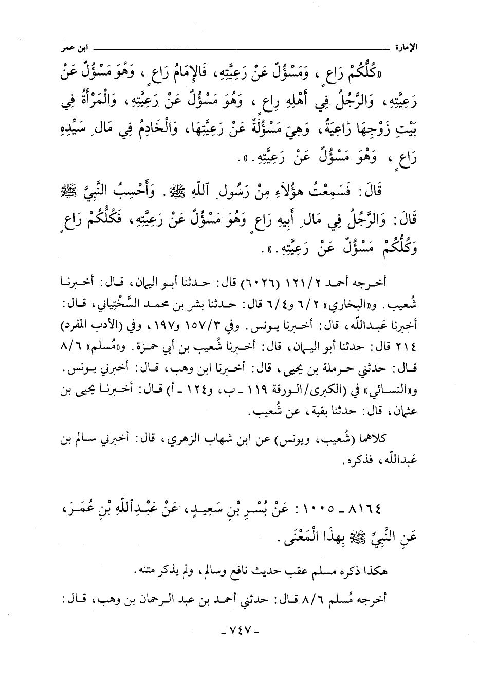 كُلُّكُمْ رَاعٍ وَمَسْئُولٌ عَنْ رَعِيَّتِهِ، فَالإِمَامُ رَاعٍ، وَهْوَ مَسْئُولٌ عَنْ رَعِيَّتِهِ، وَالرَّجُلُ فِى أَهْلِهِ رَاعٍ، وَهْوَ مَسْئُولٌ عَنْ رَعِيَّتِهِ، وَالْمَرْأَةُ فِى بَيْتِ زَوْجِهَا رَاعِيَةٌ وَهْىَ مَسْئُولَةٌ عَنْ رَعِيَّتِهَا، وَالْخَادِمُ فِى مَالِ سَيِّدِهِ رَاعٍ، وَهْوَ مَسْئُولٌ عَنْ رَعِيَّتِهِ.