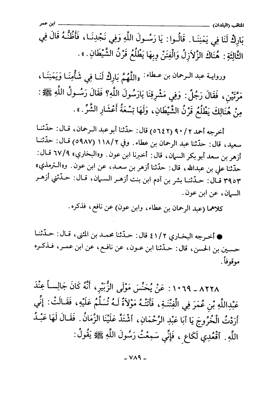 - أَخْرَجَهُ البخاري ٢/ ٤١ (١٠٣٧) قال: حَدَّثَنَا مُحَمَّدُ بْنُ الْمُثَنَّى قَالَ حَدَّثَنَا حُسَيْنُ بْنُ الْحَسَنِ قَالَ حَدَّثَنَا ابْنُ عَوْنٍ عَنْ نَافِعٍ عَنِ ابْنِ عُمَرَ قَالَ اللَّهُمَّ بَارِكْ لَنَا فِى شَامِنَا وَفِى يَمَنِنَا. قَالَ قَالُوا وَفِى نَجْدِنَا قَالَ قَالَ اللَّهُمَّ بَارِكْ لَنَا فِى شَامِنَا وَفِى يَمَنِنَا. قَالَ قَالُوا وَفِى نَجْدِنَا قَالَ قَالَ هُنَاكَ الزَّلَازِلُ وَالْفِتَنُ، وَبِهَا يَطْلُعُ قَرْنُ الشَّيْطَانِ (موقوف.