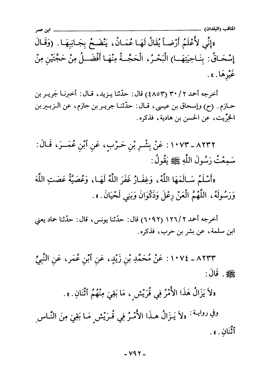 إِنِّى لأَعْلَمُ أَرْضًا يُقَالُ لَهَا عُمَانُ يَنْضَحُ بِجَانِبِهَا وَقَالَ إِسْحَاقُ بِنَاحِيَتِهَا الْبَحْرُ الْحَجَّةُ مِنْهَا أَفْضَلُ مِنْ حَجَّتَيْنِ مِنْ غَيْرِهَا.