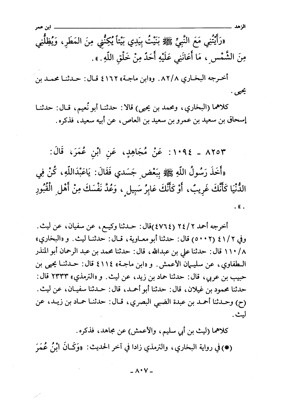 أَخْرَجَهُ أحمد ٢/ ٢٤ (٤٧٦٤) قال: حدثنا وكيع، عن سفيان، عن ليث. وفي ٢/ ٤١ (٥٠٠٢) قال: حدثنا أبو معاوية، حدثنا ليث. و"البُخَاريّ" ٨/ ١١٠ (٦٤١٦) قال: حدثنا علي بن عبد الله، حدثنا محمد بن عبد الرحمن أبو المنذر الطفاوي، عن سليمان الأعمش. و (اابن ماجة) ٤١١٤ قال: حدثنا يحيى بن حبيب بن عربي، حدثنا حماد بن زيد، عن ليث. والتِّرْمِذِيّ" ٢٣٣٣ قال: حدثنا محمود بن غيلان، حدثنا أبو أحمد، حدثنا سفيان، عن ليث (ح) وحدثنا أحمد بن عبدة الضبي البصري، حدثنا حماد بن زيد، عن ليث.