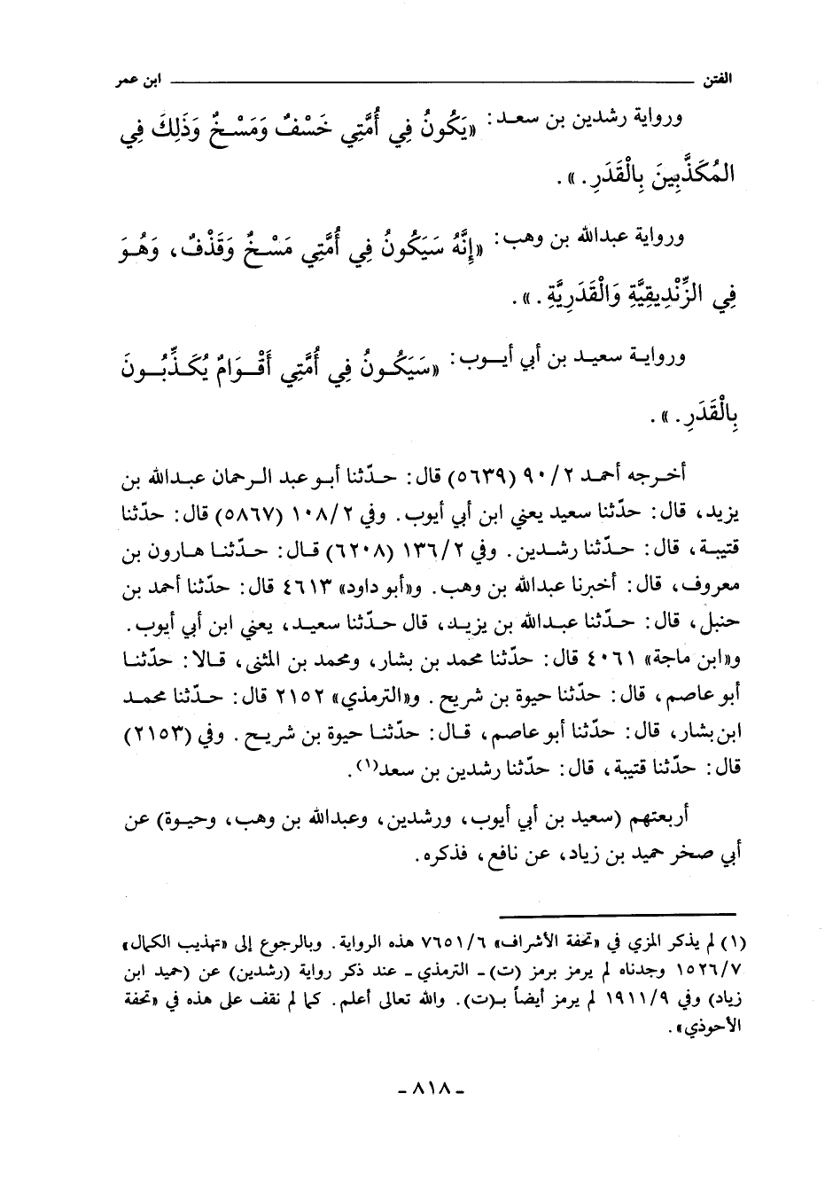 أخرجه أحمد ٢/ ٩٠ (٥٦٣٩) قال: حدثنا أبو عبد الرحمن عبد الله بن يزيد، قال: حدثنا سعيد، يعني ابن أبي أيوب. وفي ٢/ ١٠٨ (٥٨٦٧) قال: حدثنا قتيبة، حدثنا رشدين. وفي ٢/ ١٣٦ (٦٢٠٨) قال: حدثنا هارون بن معروف، قال: أخبرنا عبد الله بن وهب. و"أبو داود" (٤٦١٣) قال: حدثنا أحمد بن حنبل، قال: حدثنا عبد الله بن يزيد , قال: حدثنا سعيد , يعني ابن أبي أيوب. و"ابن ماجة" ٤٠٦١ قال: حدثنا مُحَمَّد بن بشار، ومُحَمَّد بن المثنى. قالا: حدثنا أبو عاصم، قال: حدثنا حيوة بن شريح. والتِّرْمِذِيّ" ٢١٥٢ قال: حدثنا مُحَمَّد بن بشار، قال: حدثنا أبو عاصم، قال: حدثنا حيوة بن شريح. وفي (٢١٥٣) قال: حدثنا قتيبة، حدثنا رشدين بن سعد.