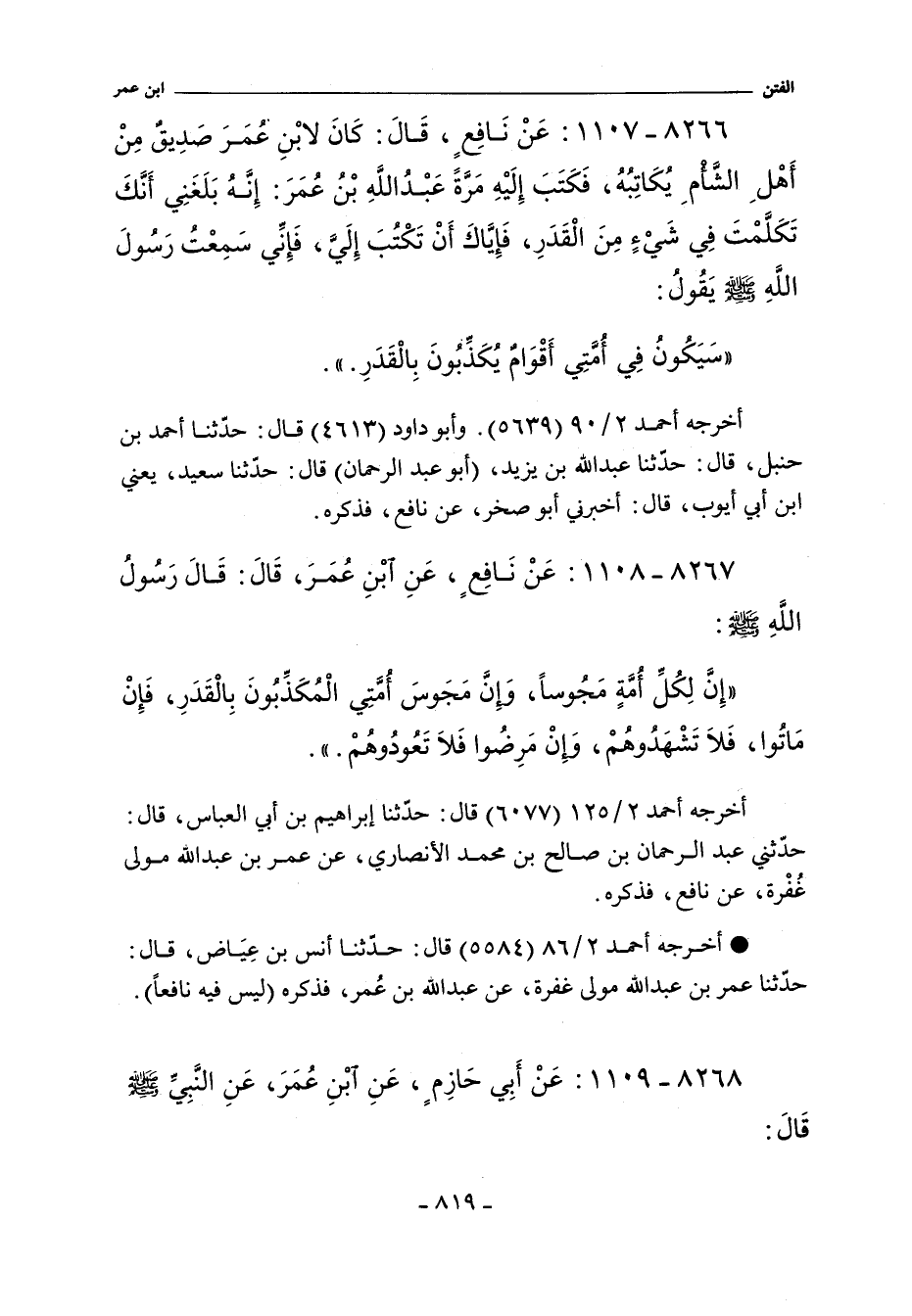 ٨٢٦٦ - عَنْ نَافِعٍ قَالَ كَانَ لاِبْنِ عُمَرَ صَدِيقٌ مِنْ أَهْلِ الشَّامِ يُكَاتِبُهُ فَكَتَبَ إِلَيْهِ مَرَّةً عَبْدُ اللَّهِ بْنُ عُمَرَ إِنَّهُ بَلَغَنِى أَنَّكَ تَكَلَّمْتَ فِى شَىْءٍ مِنَ الْقَدَرِ فَإِيَّاكَ أَنْ تَكْتُبَ إِِلَىَّ فَإِنِّى سَمِعْتُ رَسُولَ اللَّهِ صلى الله عليه وسلم يَقُولُ: