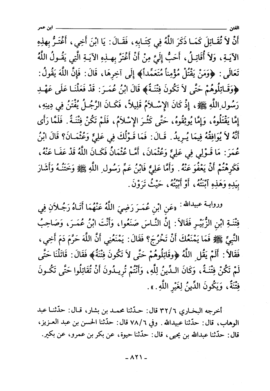 ورواية عُبَيْدُ اللَّهِ: عَنِ ابْنِ عُمَرَ رضى الله عنهما أَتَاهُ رَجُلَانِ فِى فِتْنَةِ ابْنِ الزُّبَيْرِ فَقَالَا إِنَّ النَّاسَ قَدْ ضُيِّعُوا، وَأَنْتَ ابْنُ عُمَرَ وَصَاحِبُ النَّبِىِّ صلى الله عليه وسلم فَمَا يَمْنَعُكَ أَنْ تَخْرُجَ فَقَالَ يَمْنَعُنِى أَنَّ اللَّهَ حَرَّمَ دَمَ أَخِى. فَقَالَا أَلَمْ يَقُلِ اللَّهُ (وَقَاتِلُوهُمْ حَتَّى لَا تَكُونَ فِتْنَةٌ) فَقَالَ قَاتَلْنَا حَتَّى لَمْ تَكُنْ فِتْنَةٌ، وَكَانَ الدِّينُ لِلَّهِ، وَأَنْتُمْ تُرِيدُونَ أَنْ تُقَاتِلُوا حَتَّى تَكُونَ فِتْنَةٌ، وَيَكُونَ الدِّينُ لِغَيْرِ اللَّهِ.
