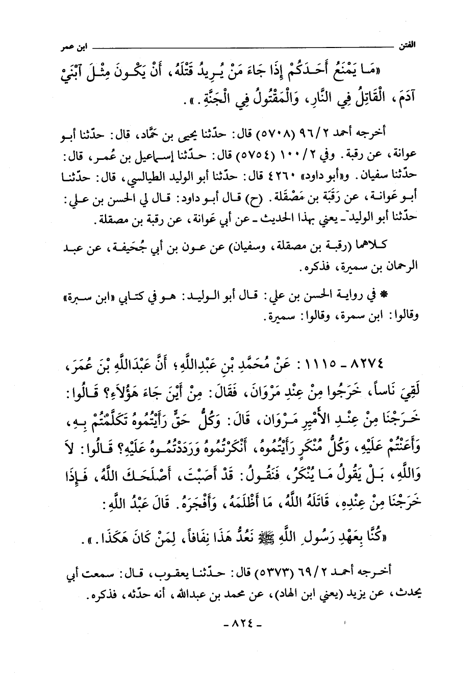 أَخْرَجَهُ أحمد ٢/ ٩٦ (٥٧٠٨) قال: حدثنا يحيى بن حَمَاد، حدّثنا أبو عوانة، عن رقبة. وفي ٢/ ١٠٠ (٥٧٥٤) قال: حدّثنا إسماعيل بن عُمر، حدّثنا سفيان. و"أبو داود" ٤٢٦٠ قال: حدّثنا أبو الوليد الطيالسي، حدّثنا أبو عَوانة، عن رَقَبَة بن مَصْقَلة (ح) قال أبوداود: قال لي الحسن بن علي: حدثنا أبو الوليد، يعني بهذا الحديث، عن أبي عَوانة.