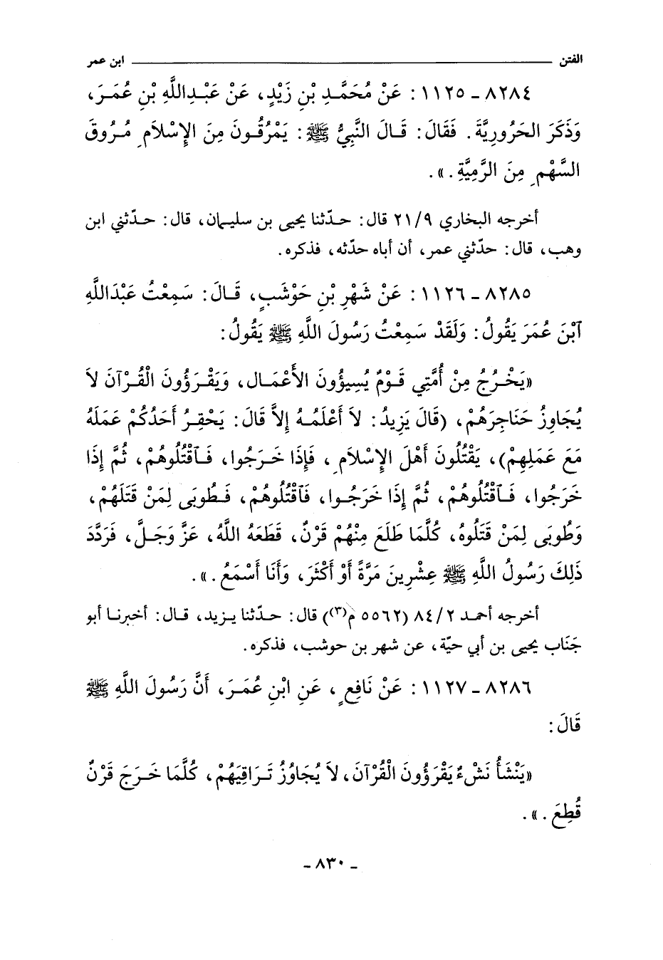 ٨٢٨٤ - عَنْ مُحَمَّدِ بْنِ زَيْدٍ , عَنْ عَبْدِ اللَّهِ بْنِ عُمَرَ , وَذَكَرَ الْحَرُورِيَّةَ. فَقَالَ: قَالَ النَّبِىُّ صلى الله عليه وسلم: