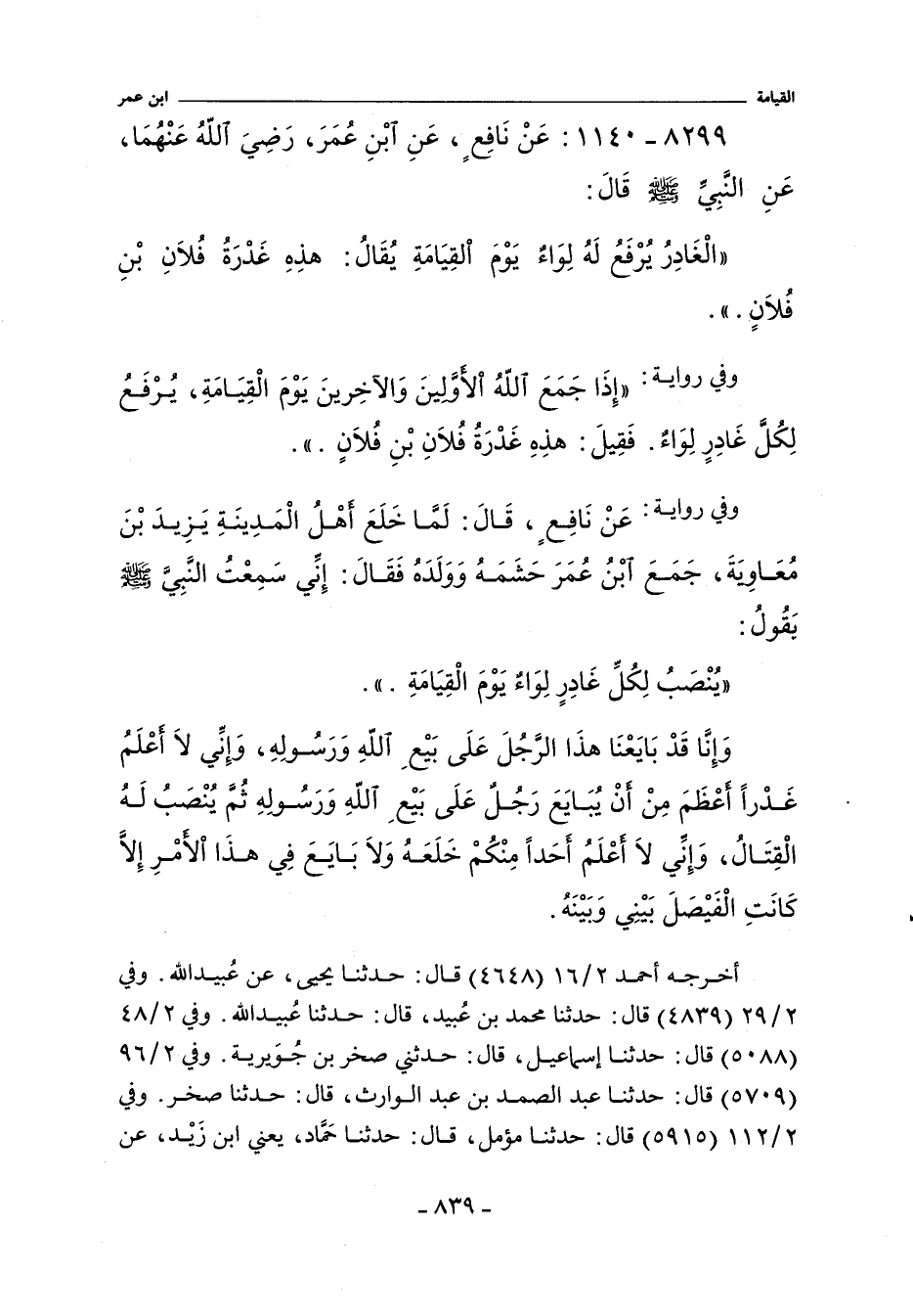 - وفي رواية: عَنْ نَافِعٍ قَالَ لَمَّا خَلَعَ أَهْلُ الْمَدِينَةِ يَزِيدَ بْنَ مُعَاوِيَةَ جَمَعَ ابْنُ عُمَرَ حَشَمَهُ وَوَلَدَهُ فَقَالَ إِنِّى سَمِعْتُ النَّبِىَّ صلى الله عليه وسلم يَقُولُ يُنْصَبُ لِكُلِّ غَادِرٍ لِوَاءٌ يَوْمَ الْقِيَامَةِ.