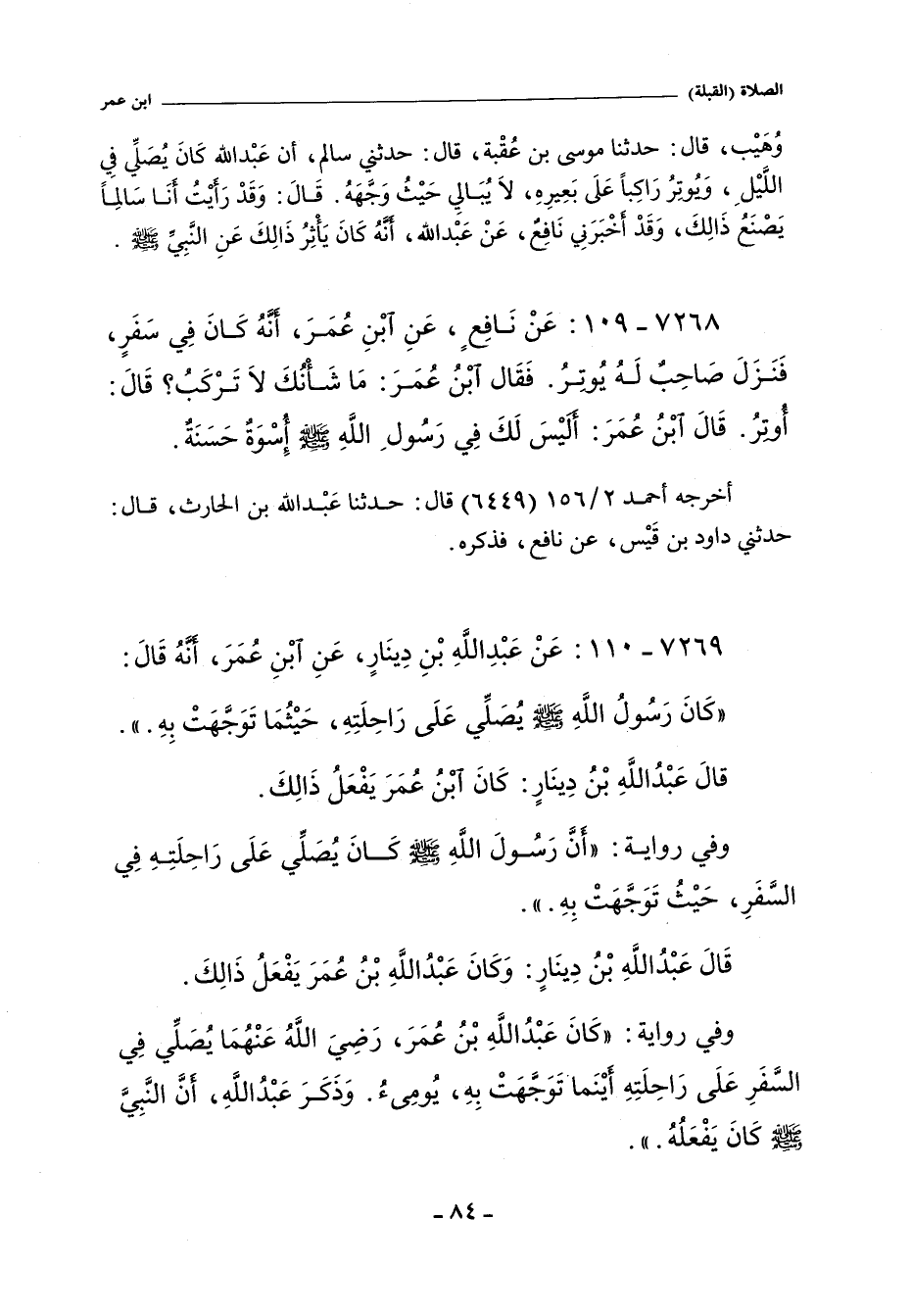 - وفي رواية: كَانَ عَبْدُ اللَّهِ بْنُ عُمَرَ - رضى الله عنهما - يُصَلِّى فِى السَّفَرِ عَلَى رَاحِلَتِهِ، أَيْنَمَا تَوَجَّهَتْ يُومِئُ. وَذَكَرَ عَبْدُ اللَّهِ أَنَّ النَّبِىَّ صلى الله عليه وسلم كَانَ يَفْعَلُهُ.