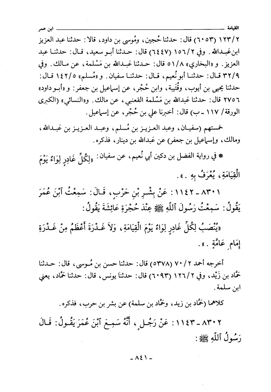 ٨٣٠١ - عَنْ بِشْرِ بْنِ حَرْبٍ سَمِعْتُ ابْنَ عُمَرَ يَقُولُ سَمِعْتُ رَسُولَ اللَّهِ صلى الله عليه وسلم عِنْدَ حُجْرَةِ عَائِشَةَ يَقُولُ: