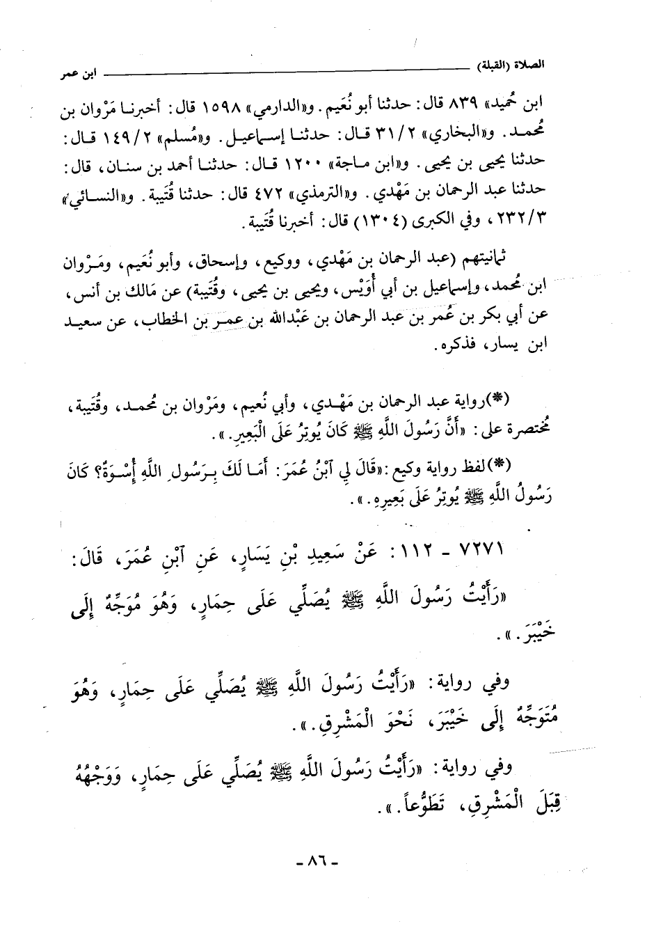 وفي رواية: رَأَيْتُ رَسُولَ اللَّهِ صلى الله عليه وسلم يُصَلِّى عَلَى حِمَارٍ وَهُوَ مُتَوَجِّهٌ إِلَى خَيْبَرَ نَحْوَ الْمَشْرِقِ.