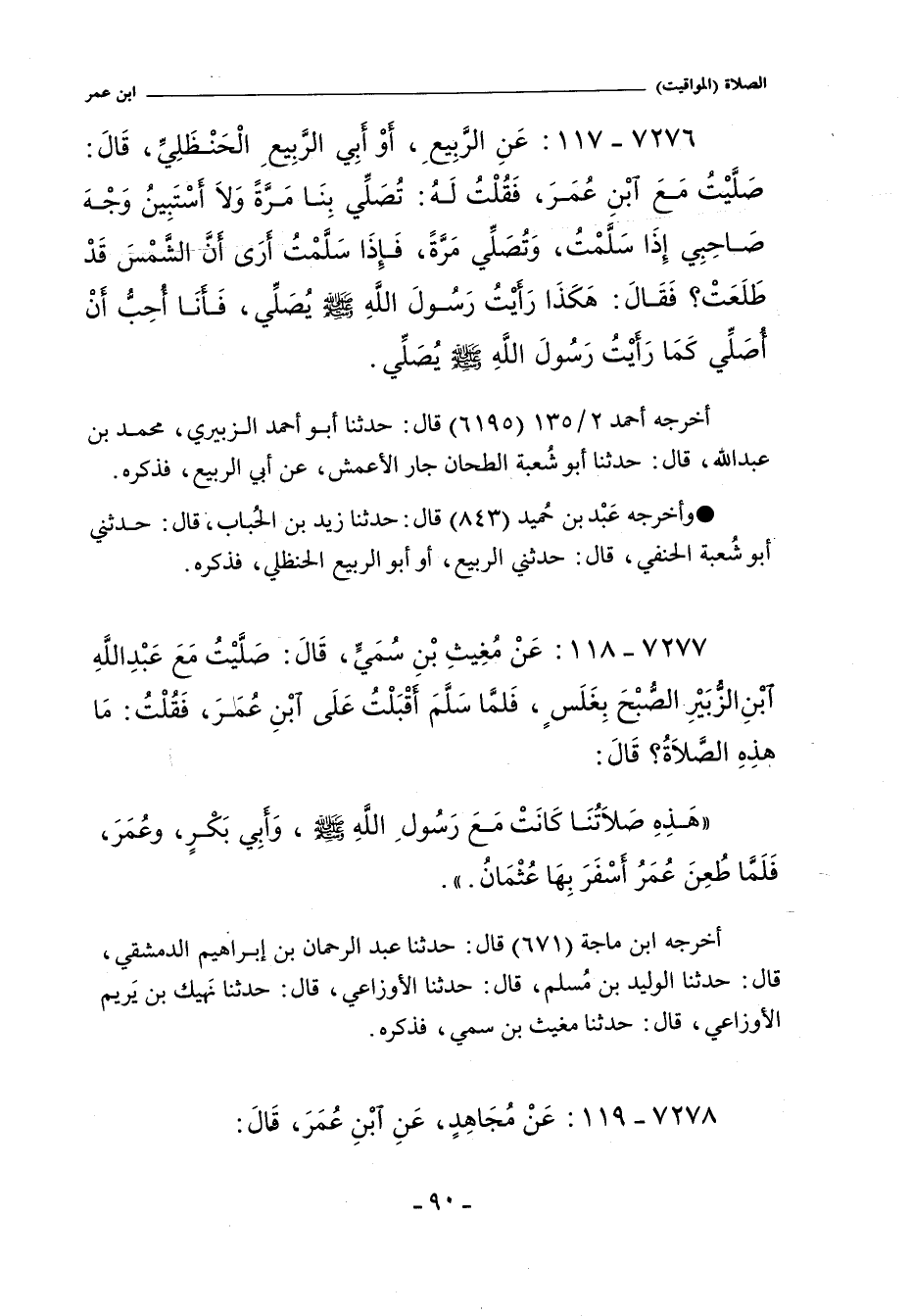 ٧٢٧٦ - عَنْ الرَّبِيعِ، أوْ أَبِي الرَّبِيعِ الْحَنْظَلِيِّ، قَالَ: صَلَّيْتُ مَعَ ابْنِ عُمَرَ، فَقُلْتُ لَهُ: تُصَلِّي بِنَا مَرَّةً، وَلَا أَسْتَبِينُ وَجْهَ صَاحِبِي إِذَا سَلَّمْتُ، وَتُصَلِّي مَرَّةً، فَإِذَا سَلَّمْتُ أَرَى أَنَّ الشَّمْسَ قَدْ طَلَعَتْ؟ فَقَالَ: هَكَذَا رَأَيْتُ رَسُولَ اللهِ صلى الله عليه وسلم يُصَلِّي، فَأَنَا أُحِبُّ أَنْ أُصَلِّيَ كَمَا رَأَيْتُ رَسُولَ اللهِ صلى الله عليه وسلم يُصَلِّي.