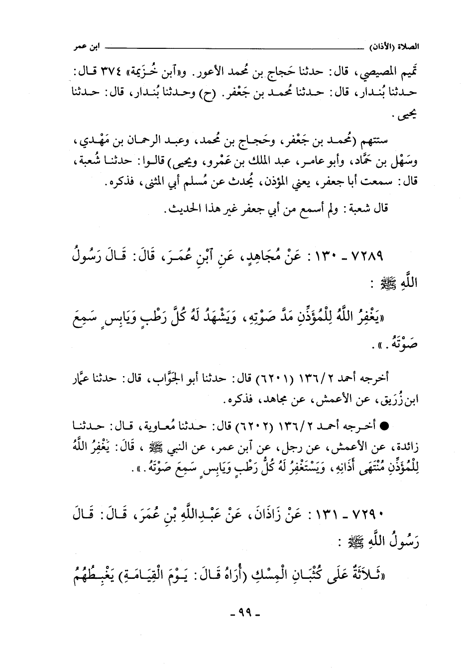 - أخرجه أحمد ٢/ ١٣٦ (٦٢٠٢) قال: حَدَّثَنَا مُعَاوِيَةُ , حَدَّثَنَا زَائِدَةُ عَنِ الأَعْمَشِ عَنْ رَجُلٍ عَنِ ابْنِ عُمَرَ عَنِ النَّبِىِّ صلى الله عليه وسلم , قَالَ: