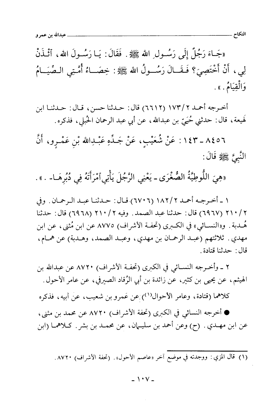 أخرجه أحمد ٢/ ١٨٢ (٦٧٠٦) قال: حدَّثنا عبد الرحمن، قال: همام أنبأنا، عن قتادة. وفي ٢/ ٢١٠ (٦٩٦٧) قال: حدَّثنا عبد الصمد، حدثنا همام، حدَّثنا قتادة. و"عبد الله بن أحمد" ٢/ ٢١٠ (٦٩٦٨) قال: حدَّثنا هُدبة، حدثنا همام، قال: سئل قتادة عن الذي يأتي امرأته في دبرها؟ فقال قتادة. و"النَّسائي" في "الكبرى" ٨٩٤٧ قال: أَخْبَرنا عبد الله بن الهيثم بن عثمان، قال: حدَّثنا يَحيى بن كثير أبو غسان، قال: حدَّثنا زائدة بن أبي الرُّقاد الصيرفي، عن عامر الأحول. وفي (٨٩٤٨) قال: أَخْبَرنا محمد بن المثنى، عن عبد الرحمن. قال: حدثنا همام، عن قتادة.