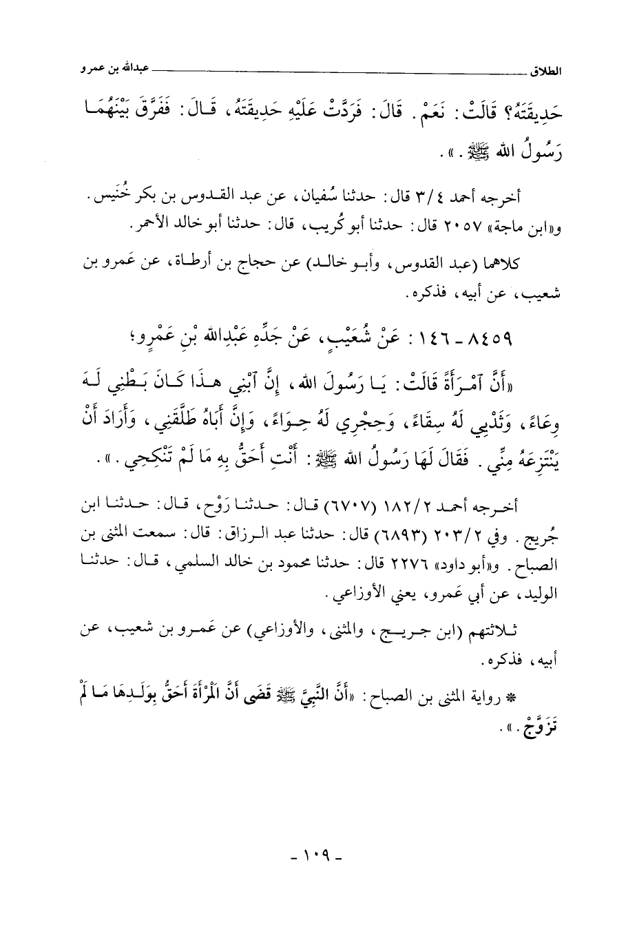 - وفي رواية: أَنَّ النَّبِيَّ صلى الله عليه وسلم قَضَى أَنَّ الَمْرْأَةَ أَحَقُّ بِوَلَدِهَا، مَا لَمْ تَزَوَّجْ.